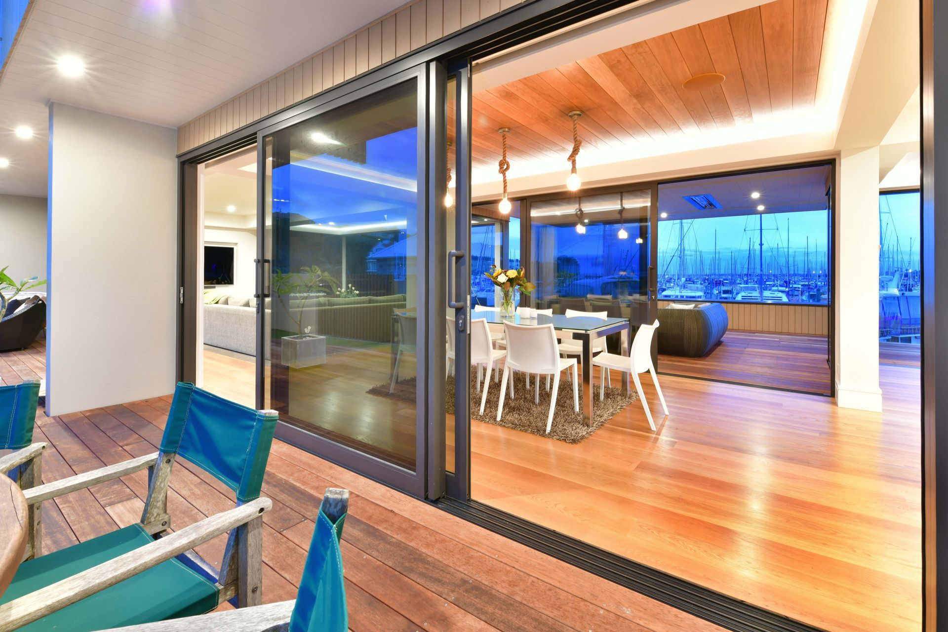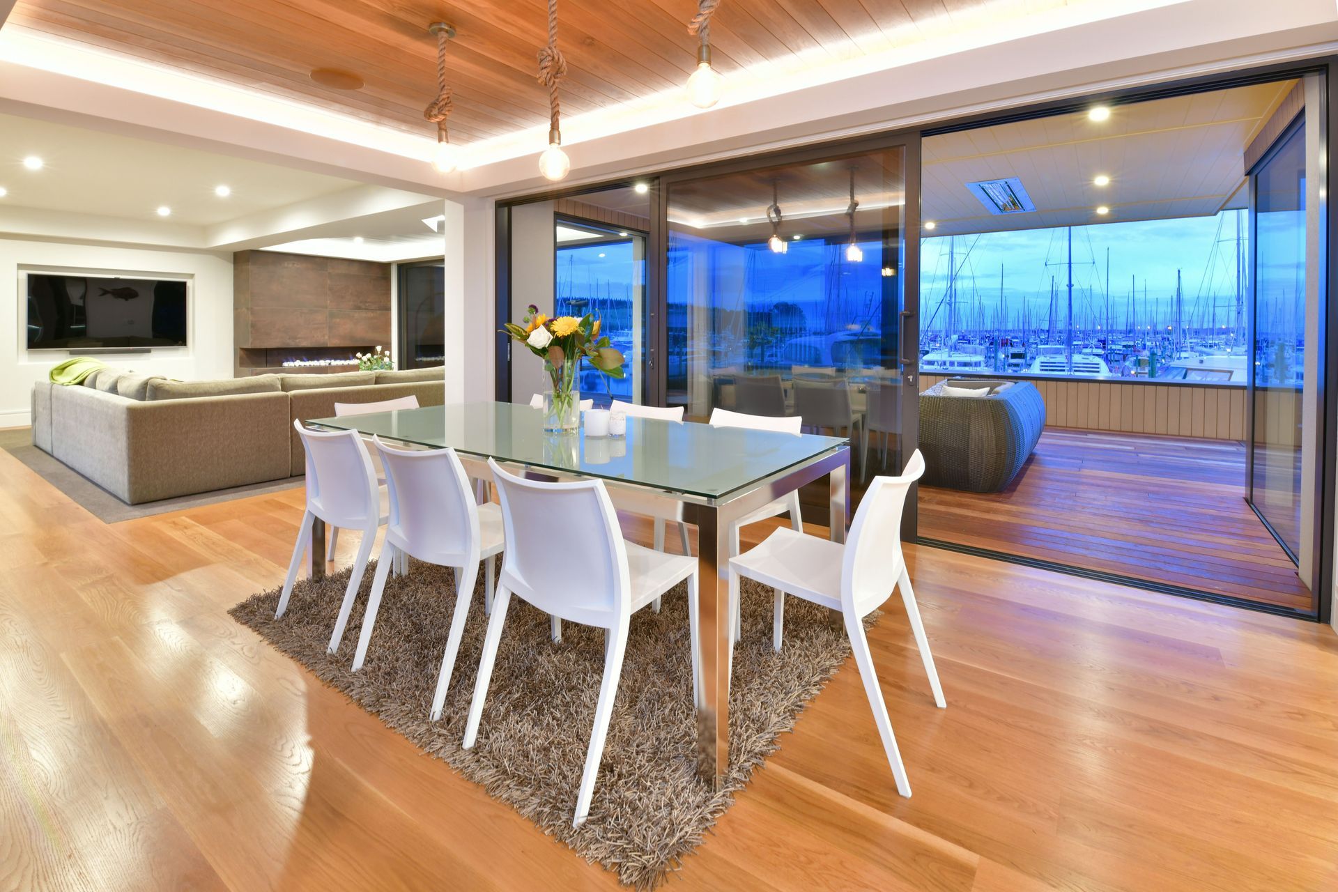 ArchiPro Project Summary - Elegant harbour front home featuring premium oak timber flooring and meticulously finished wooden elements, including a striking feature ceiling paneling, a wooden kitchen bench, and solid oak stairs, all treated with Osmo Polyx oil for lasting beauty.