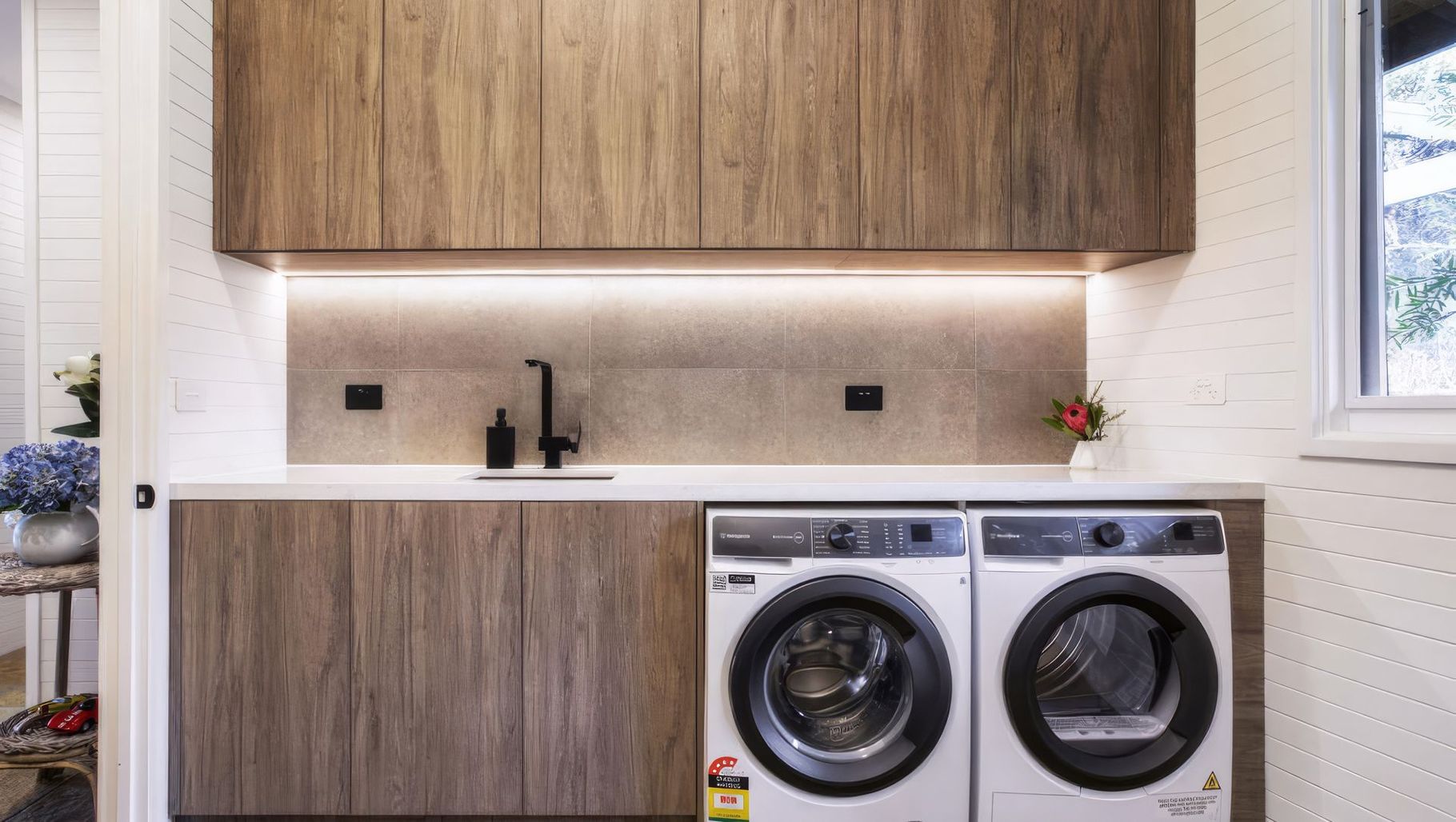 ArchiPro Project Summary - Renovated laundries on the Great Ocean Road featuring clean lines, maximized storage, and workspace with Caesar stone benchtops and Antico oak cabinetry, complemented by stylish task lighting for a seamless finish.