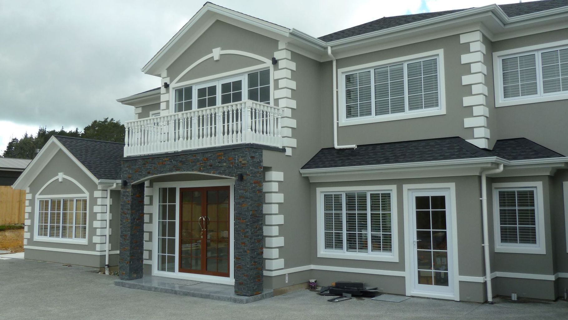 ArchiPro Project Summary - The Greenhithe project in Auckland features modern architecture with grey siding, sash windows, and refined molding, creating a sophisticated residence that enhances curb appeal.