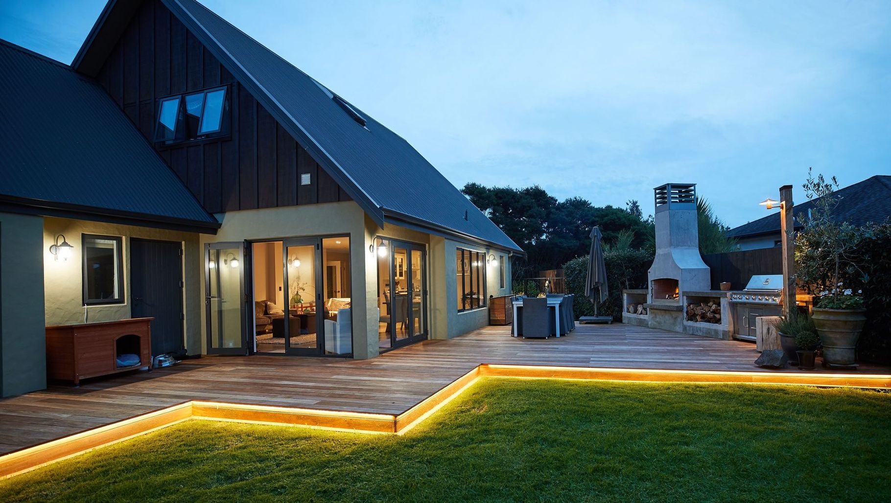 ArchiPro Project Summary - A modern Tuscan garden inspired by Italian lifestyle, featuring raised decking, elegant floating steps, and a spacious entertainment area with a large outdoor fire and pizza oven.