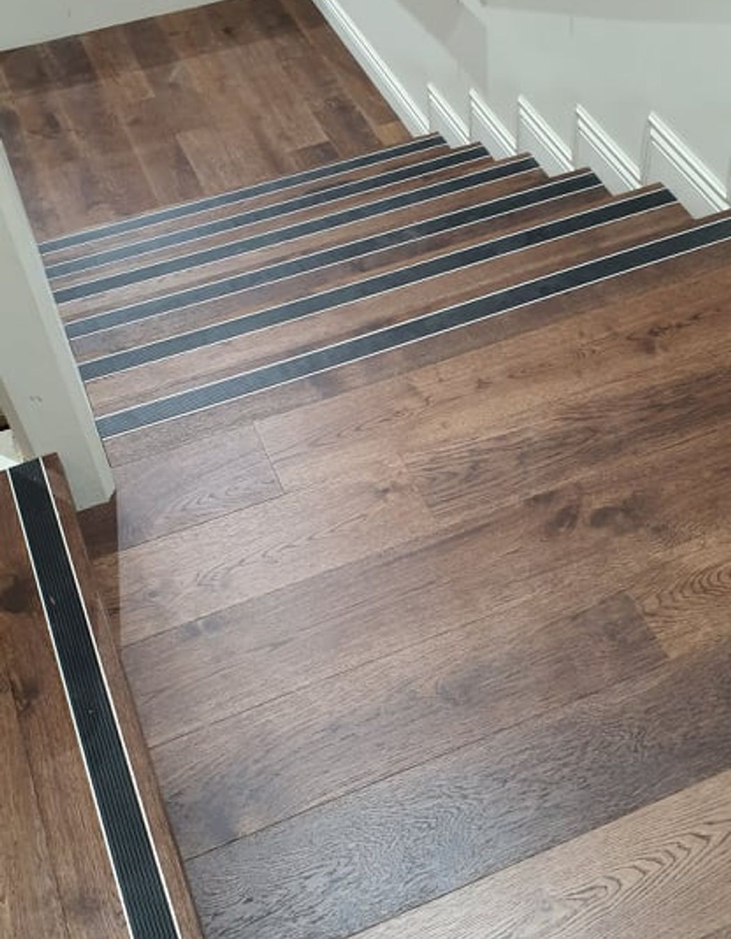 ArchiPro Project Summary - Installation of custom wooden flooring with safety tread on concrete stairs at Gursikh Temple, utilizing Europlank Legacy Oak Brown for enhanced aesthetics and durability ahead of the temple's opening.