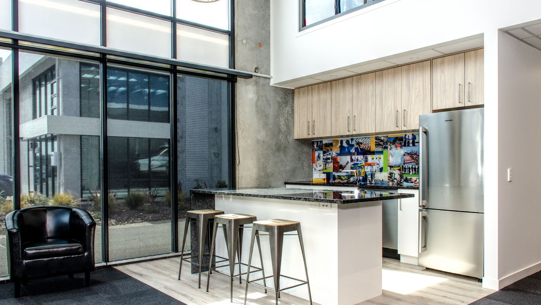 The GYB Insurance offices are planned in an L shape around a central lightwell; which provides a contemporary interior with a strong visual connection between the offices and flexible meeting spaces below. The raw concrete walls are retained, utilising Autex panels to help reduce reverberation. Use of sliding frosted glass walls means that there is total flexibility and allows for three different meeting spaces, including a modern kitchen, lounging area and boardroom. The whole downstairs space can then be used for client functions and networking. The boardroom features a panel above the table, reducing sound reverberation and provides feature LED lighting. The upper open plan office looks across and also down into the lightwell and utilises flexible sit/stand workstations. The play of natural light within the space allows for stimulation and vibrancy. Utilising passive solar design to warm the environment and use of artificial LED lighting is minimal due to the light filtering through from the central lightwell. Sustainability was important, recycling the roller door, utilising low VOC carpets, vinyls and paint. The ceilings are 80% recycled material and fully recycled at end of life cycle. Use of colour was important to enhance their brand design colours of mustard and brown, which I then teamed with grey screens and offset with Resene feature wall colours and carpet. The design embraces flexible, modern open-plan offices. The dramatic full height corner glazing and lightwell, washes the entire interior with light, creating an energised space.