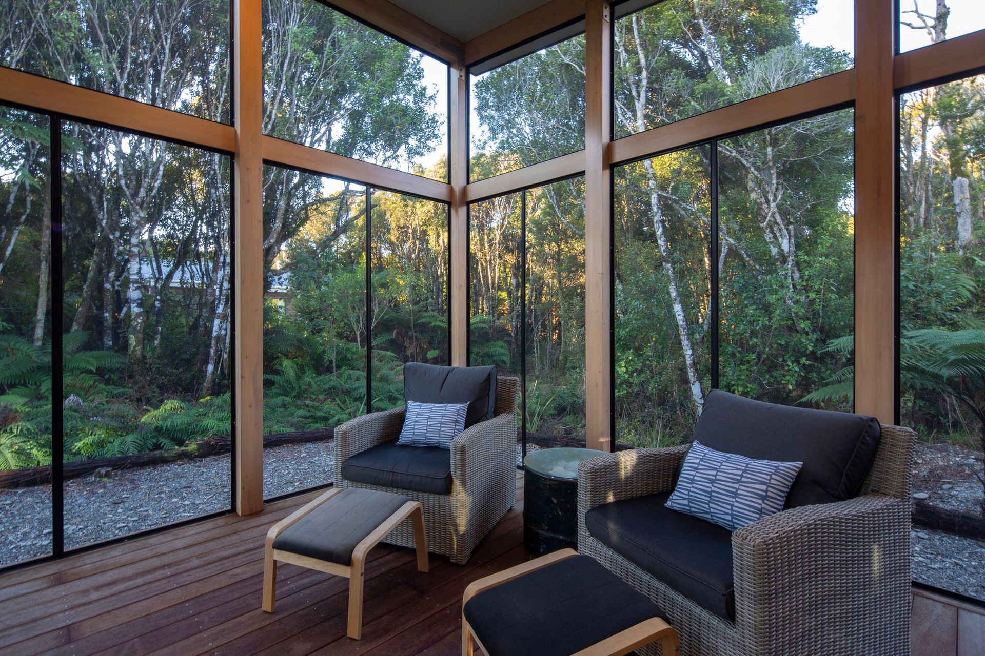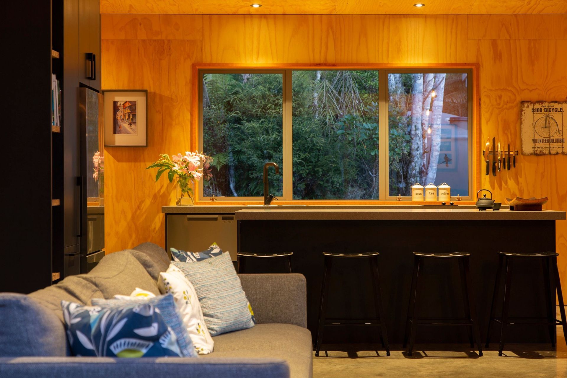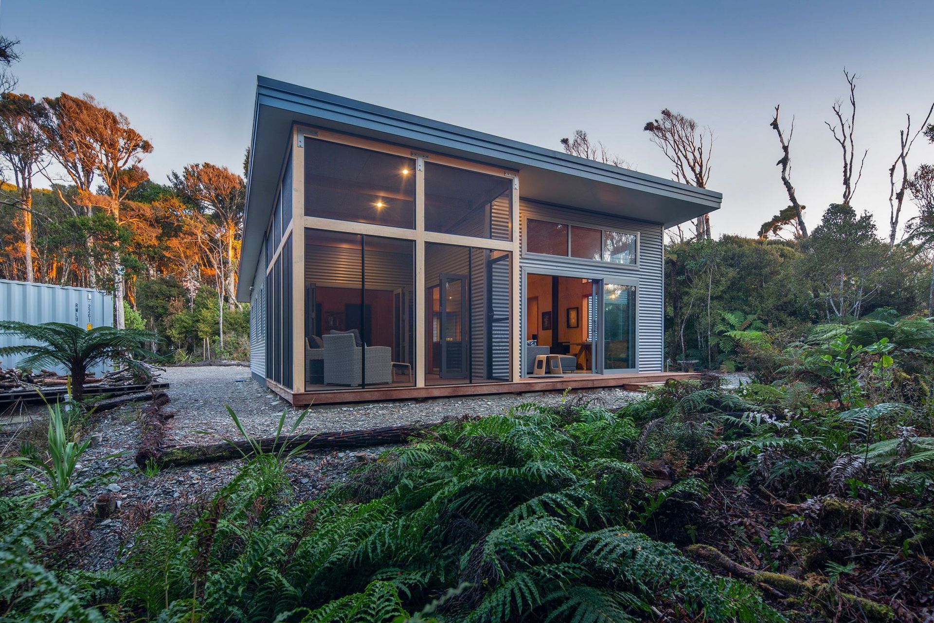 ArchiPro Project Summary - A challenging build in a stunning remote location, featuring a MAXRaft slab, SIP panel construction, double-glazed joinery, and a unique outdoor area, all harmoniously integrated into the breathtaking West Coast native bush.