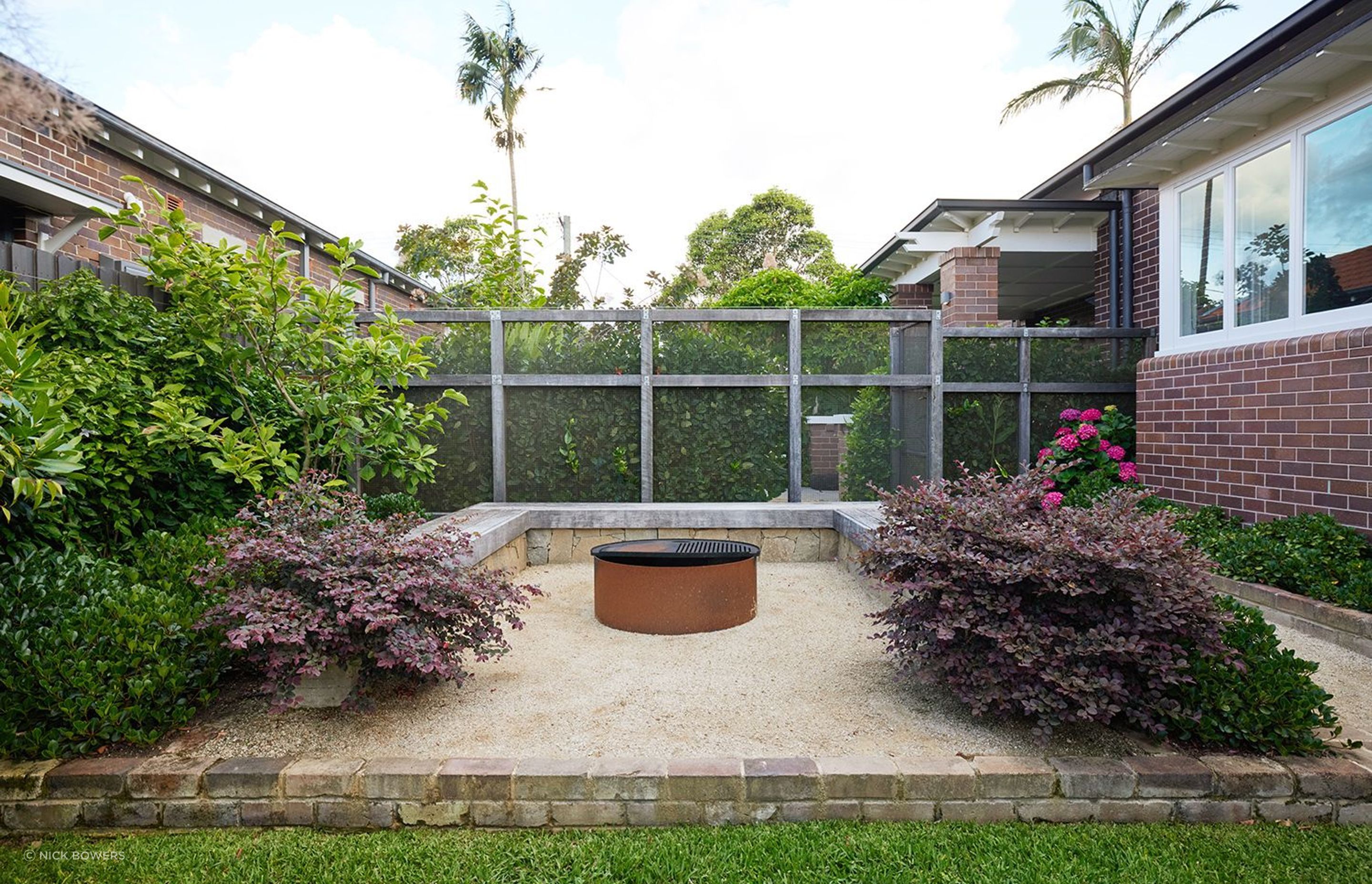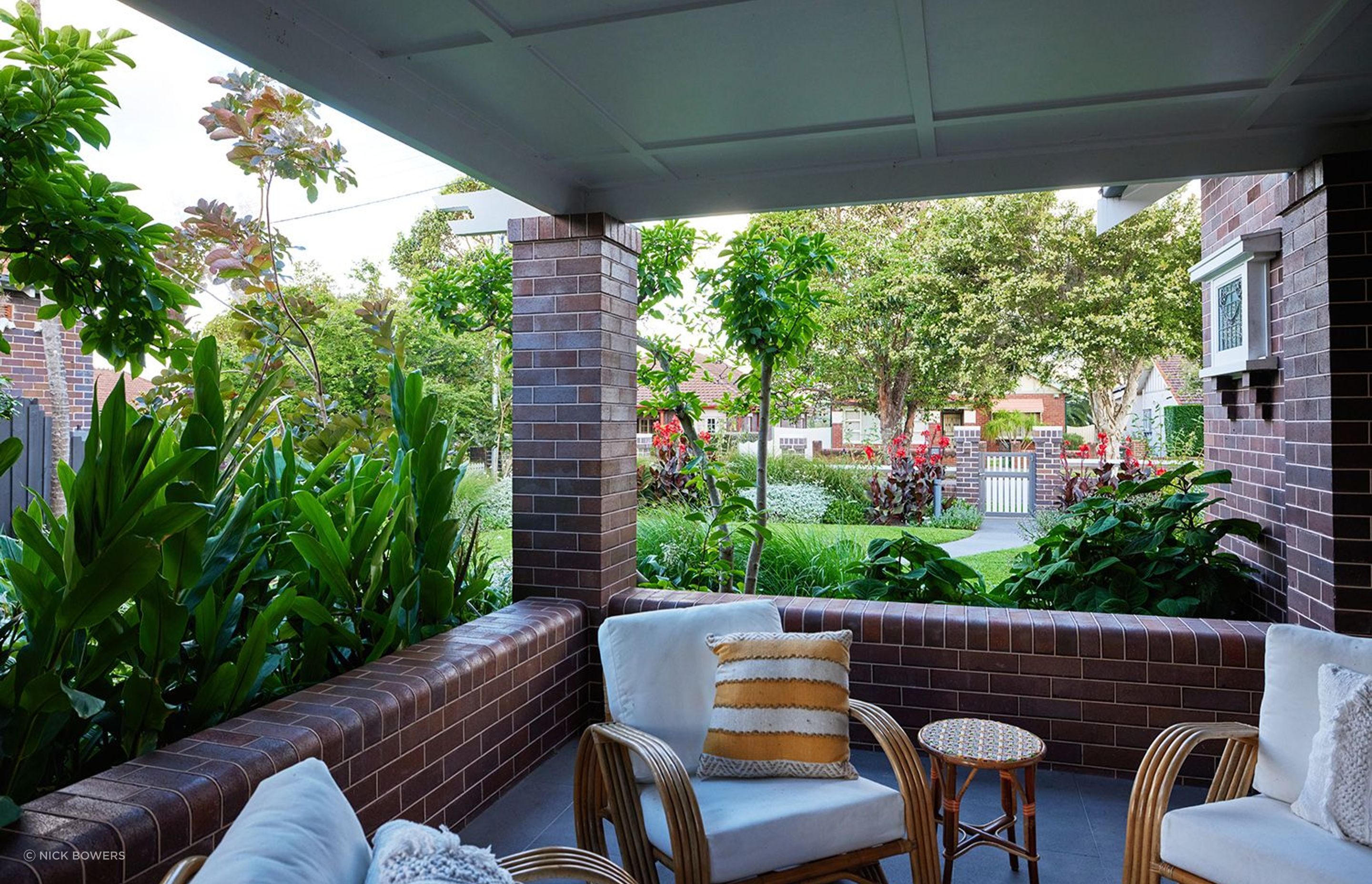 In the front garden, layered textural planting frames the house and boundary fences, with species chosen for their vibrant flowers and ever-changing seasonal foliage. A curving bluestone pathway cuts crisply through the immaculate lawn, leading you from the gate to the door.