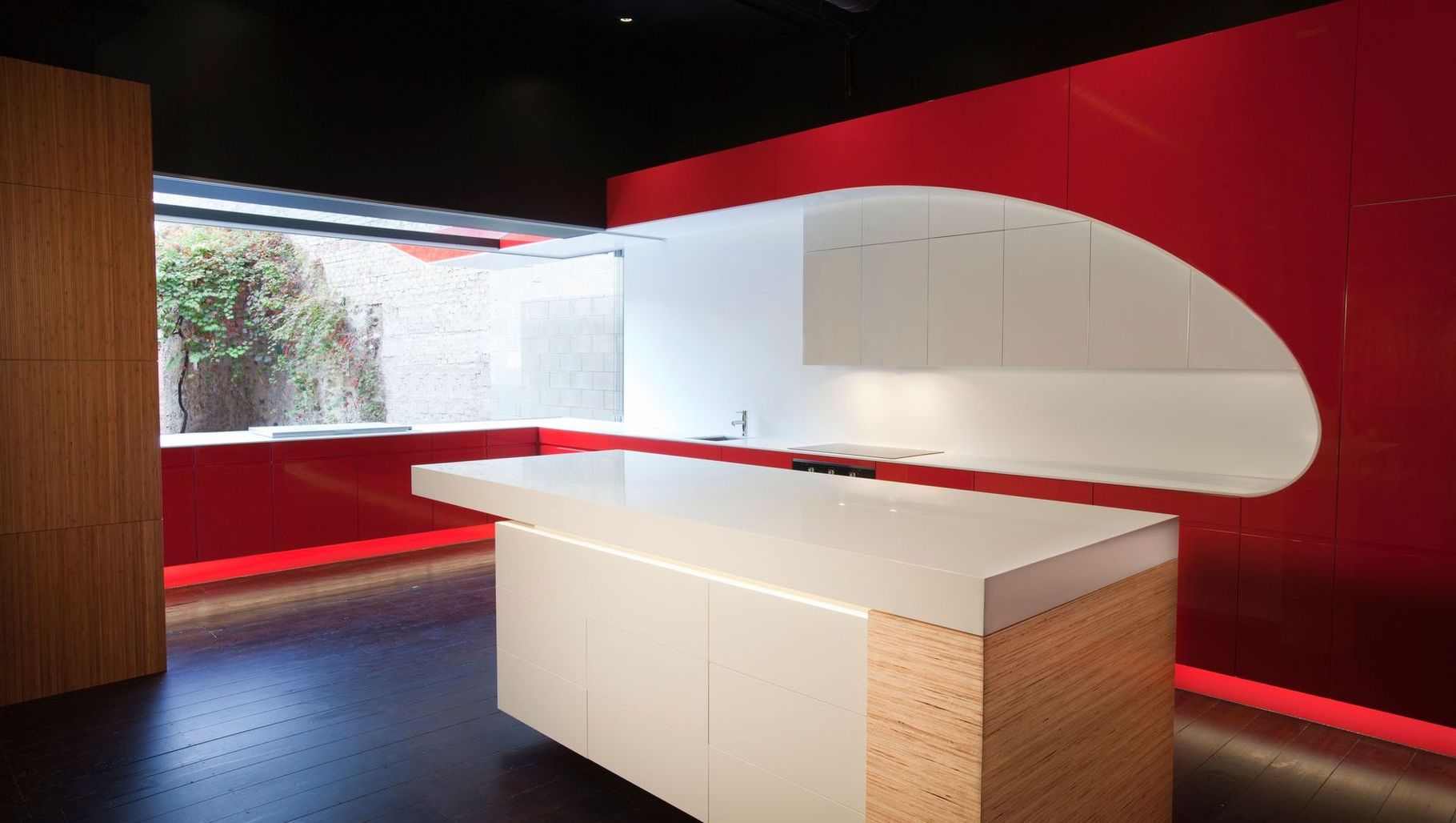 ArchiPro Project Summary - Innovative Hafele Commercial Showroom featuring a virtual apartment and a striking patent red curved kitchen, harmoniously blending heritage architecture with contemporary design elements in Adelaide's iconic Henry Austin building.