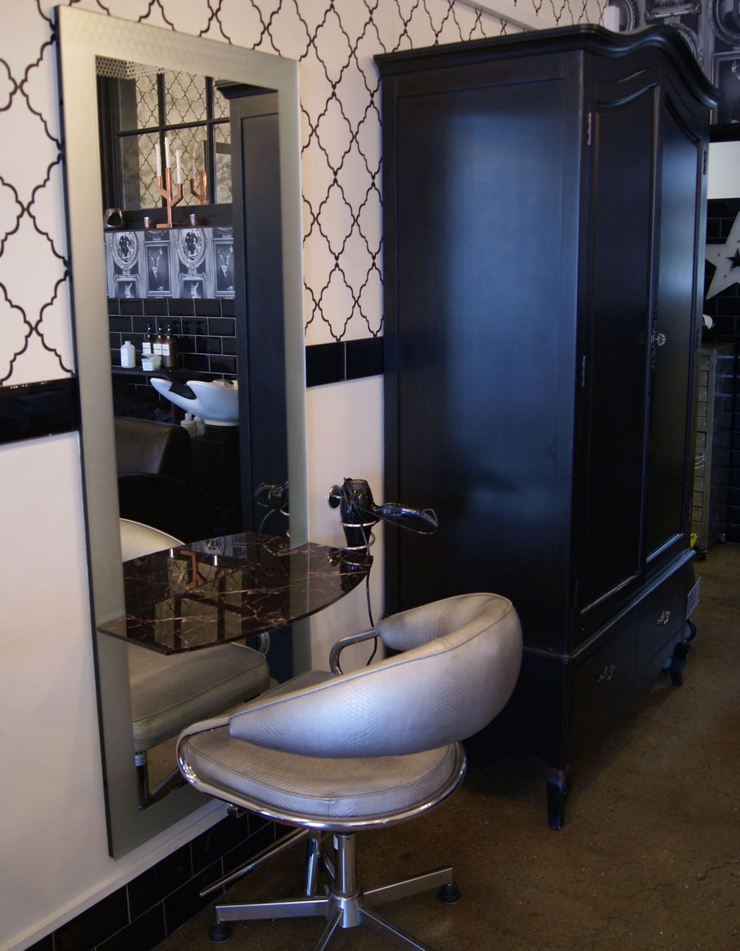 ArchiPro Project Summary - A vibrant hair salon transformation featuring high-impact wallpaper, glossy black tiles, and repurposed furnishings, creating a stylish backdrop for a unique art collection while incorporating playful elements like dog-themed wallpaper and elegant accents.