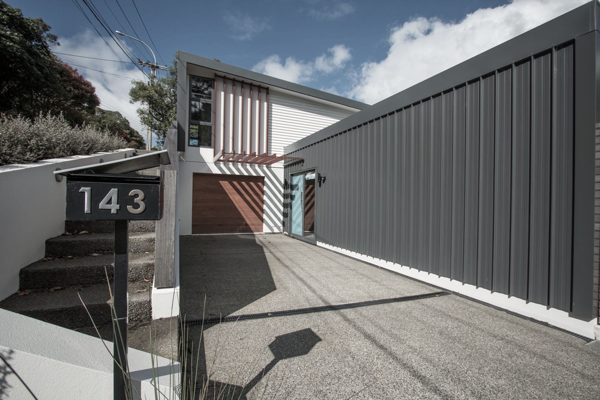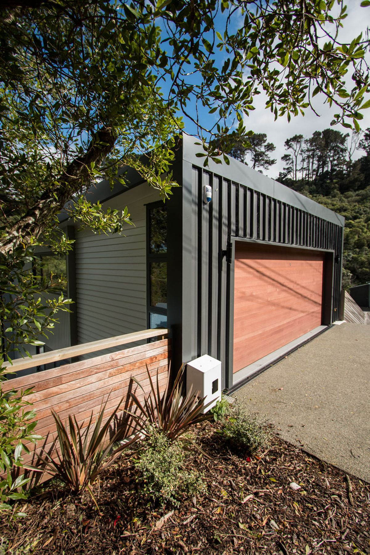 ArchiPro Project Summary - Contemporary house design maximizing vehicle and boat storage, outdoor living, sunlight, and views on a challenging sloping site in Wellington.
