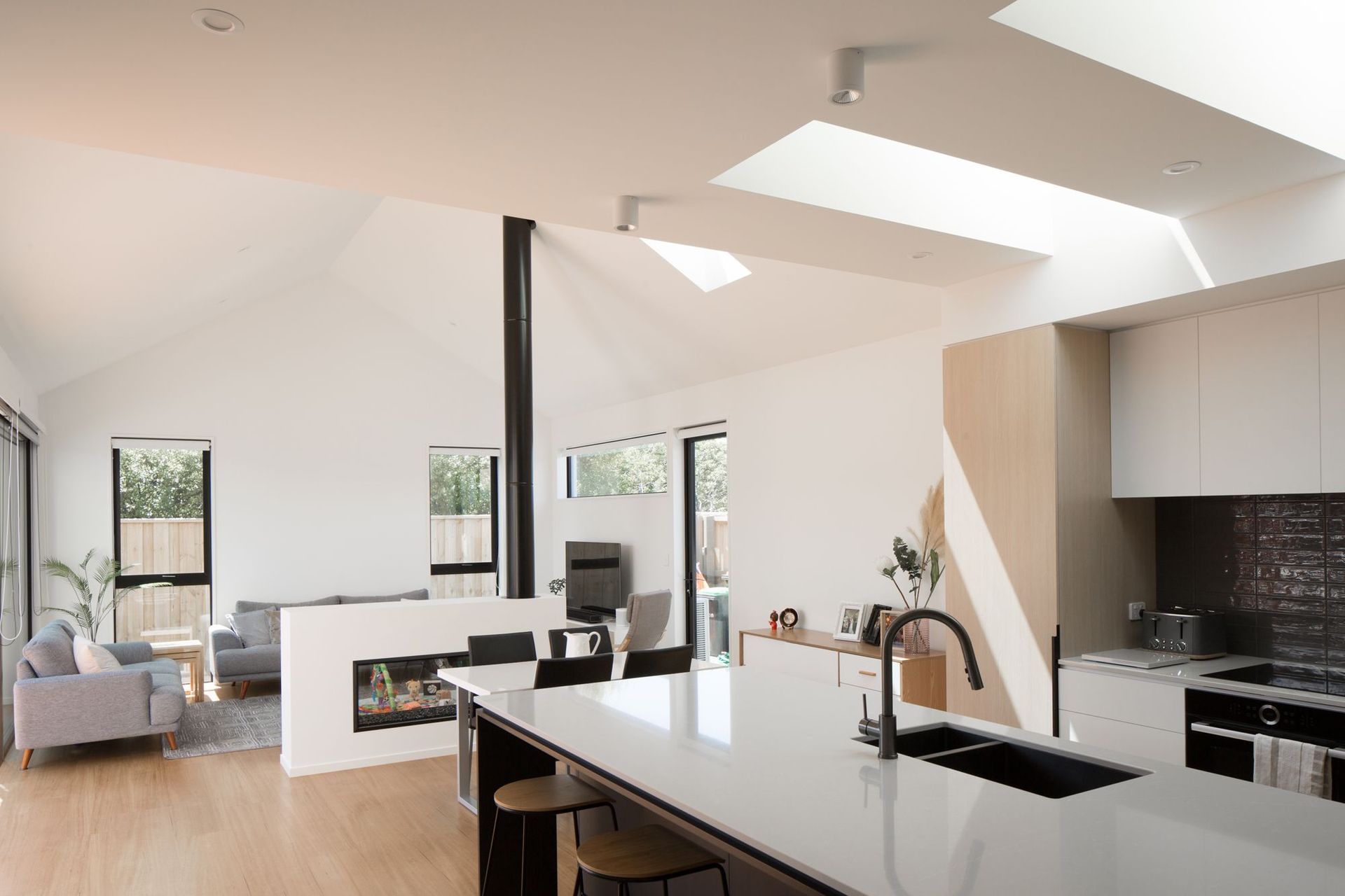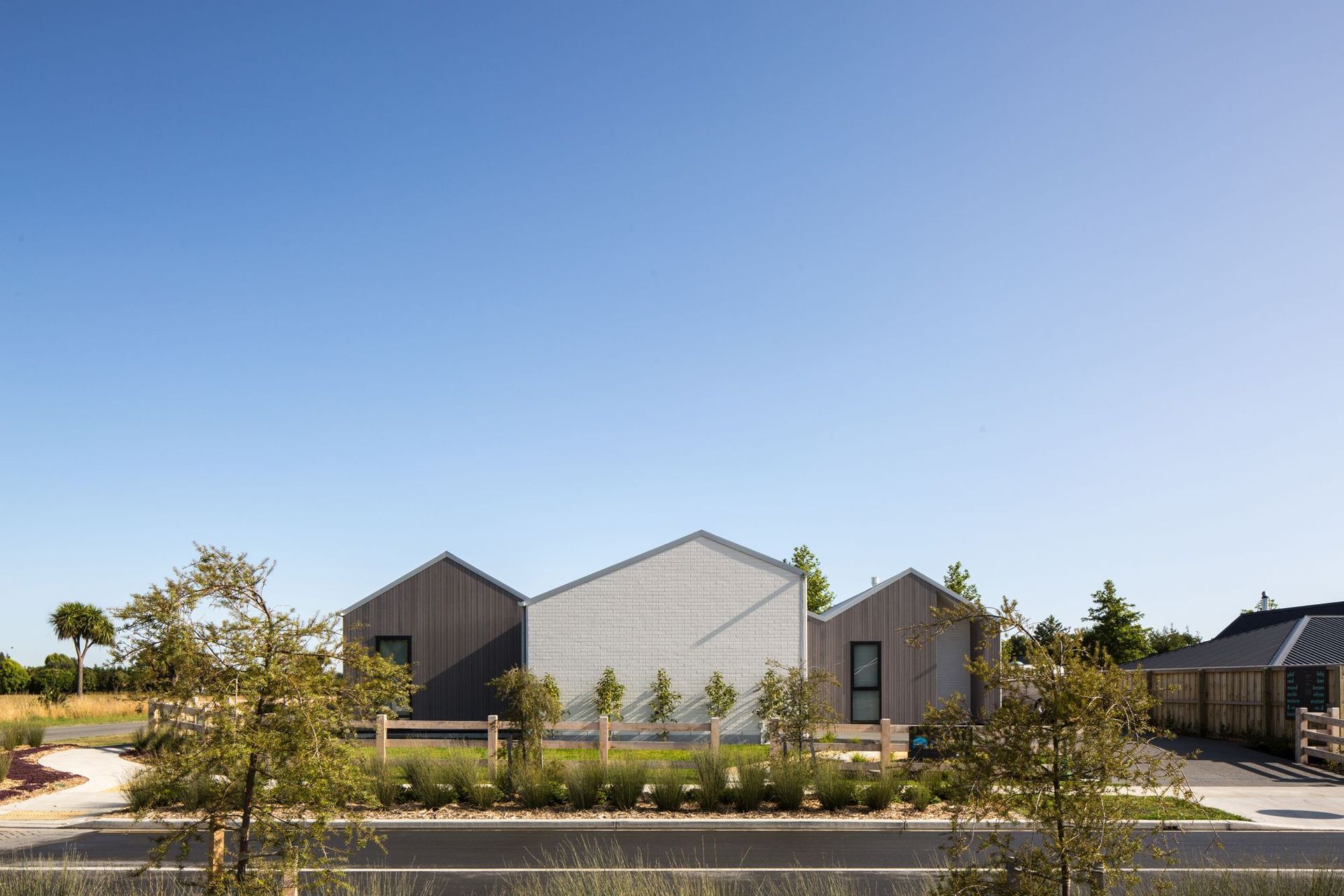 ArchiPro Project Summary - Triple Gable House featuring a secluded family courtyard, vertical shiplap cedar and white brick cladding, skillion ceiling, and skylights for enhanced natural light.
