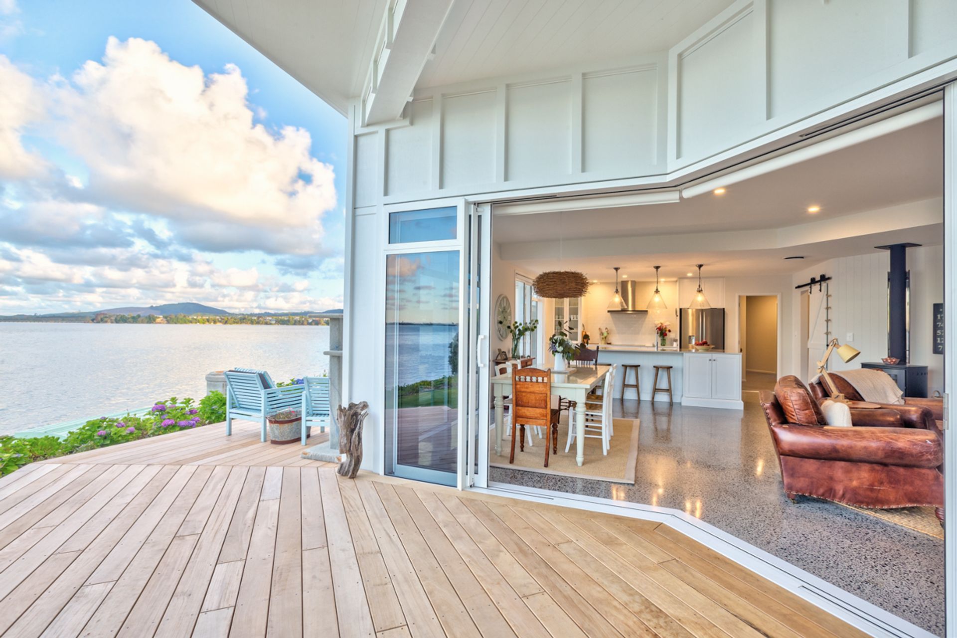 ArchiPro Project Summary - Award-winning harbourside renovation featuring uninterrupted views, Hardy Groove internal walls, and polished salt and pepper concrete floors.
