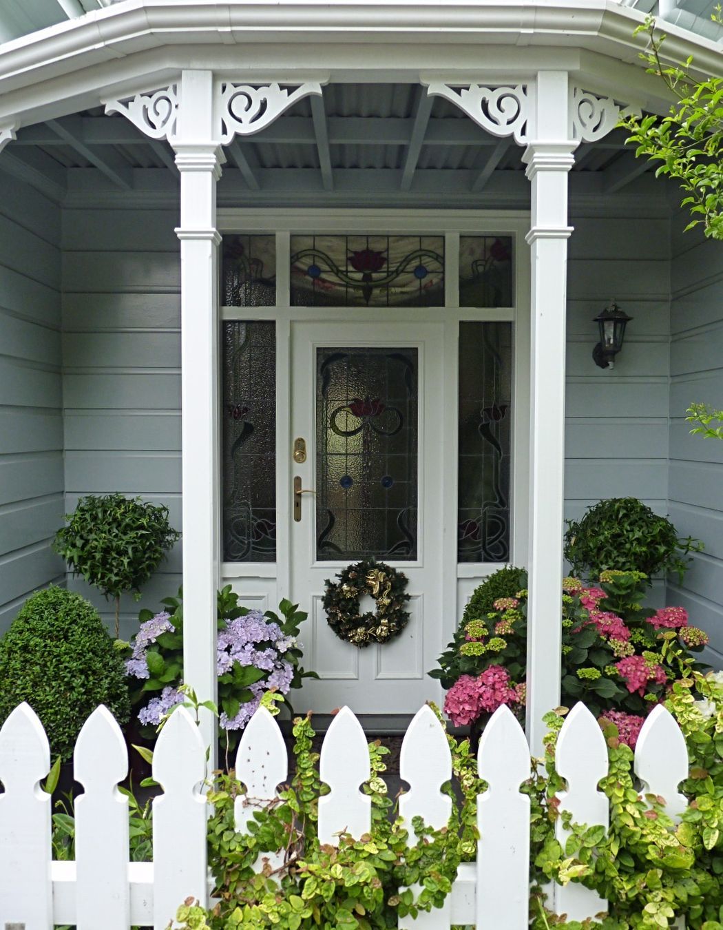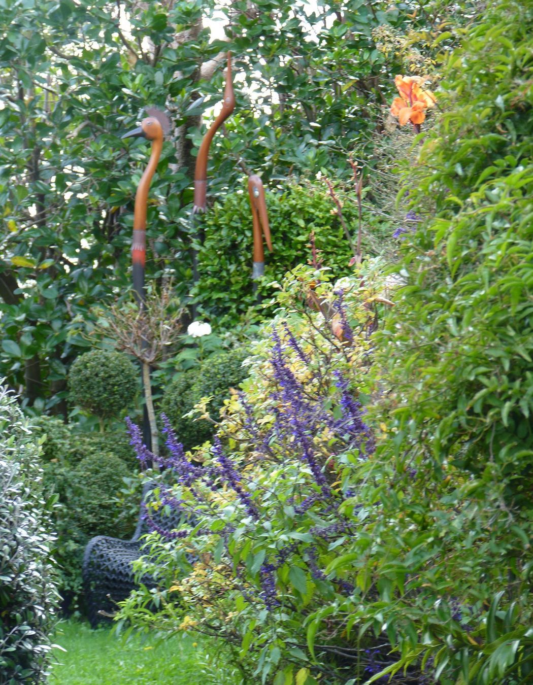 ArchiPro Project Summary - A versatile garden that blends family living, workspace, and creative experimentation, featuring a formal entrance garden, a sunny back garden with a dark stained deck, and unique painted trees adorned with clematis.