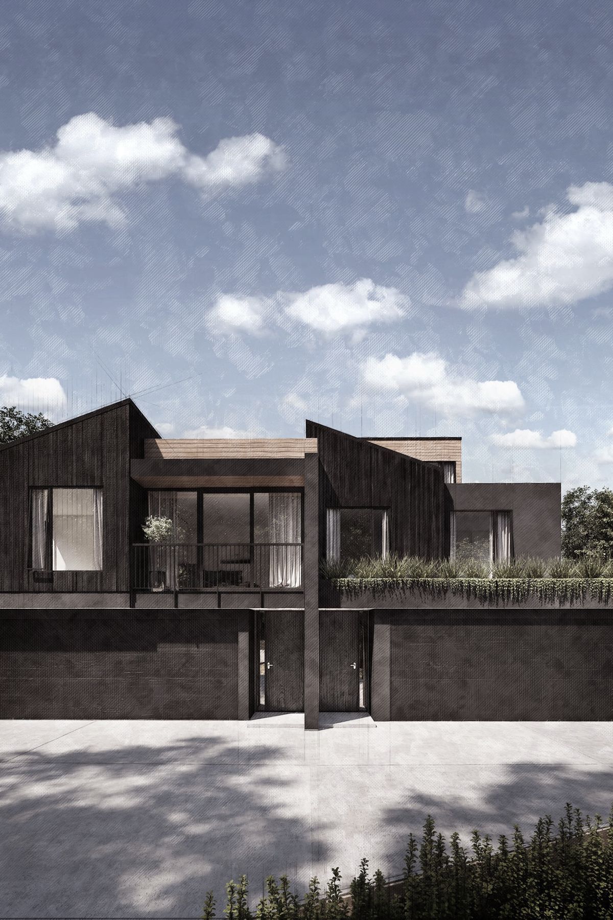 ArchiPro Project Summary - Innovative duplex design in Hauraki, Auckland, featuring 437m2 of living space across two dwellings, 8 bedrooms, and 2 double garages, harmoniously blending dark and natural materials on a challenging sloping site.
