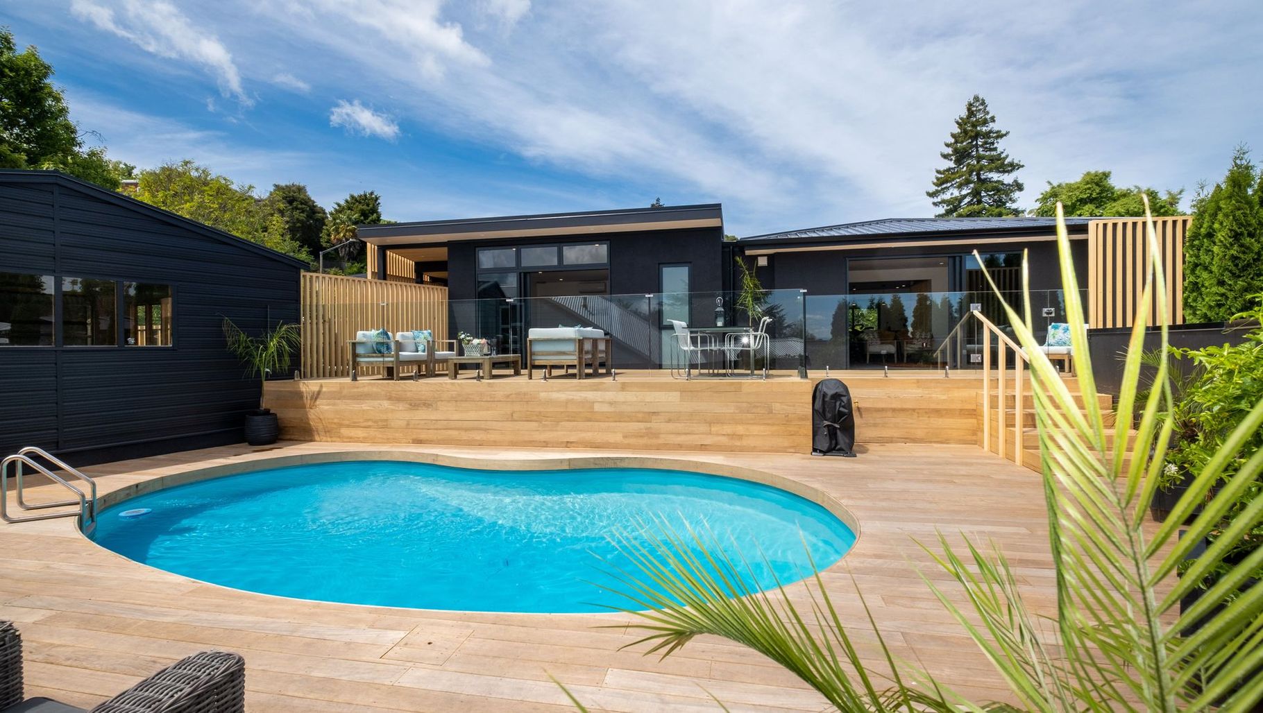 ArchiPro Project Summary - A stunning transformation of a 1940s stucco bungalow into a luxurious modern residence, featuring a master bedroom and ensuite extension, complemented by cedar screens, fencing, and expansive split-level decking surrounding the existing pool.