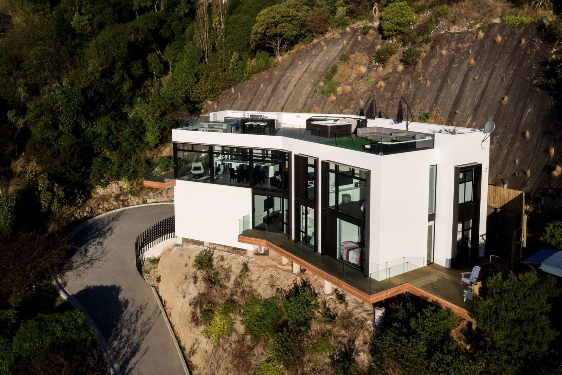 ArchiPro Project Summary - Heberden Residence: A striking architectural achievement featuring innovative CLT structural floors and wool insulation, set on a challenging steep site with breathtaking views over Sumner beach, designed by Aaron Jones of Urban Function.