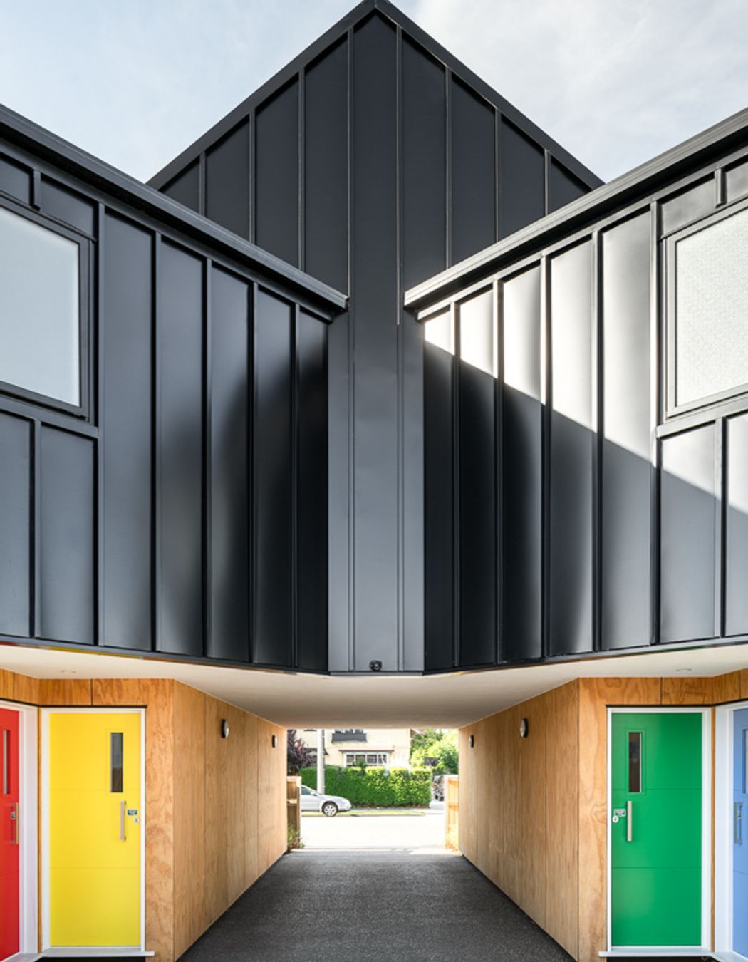 ArchiPro Project Summary - Innovative four-apartment development on a compact inner-city site, featuring a residential façade with gable forms, north-facing courtyards and balconies, and inspired by European loft aesthetics, constructed with lightweight timber and clad in black steel and plywood.