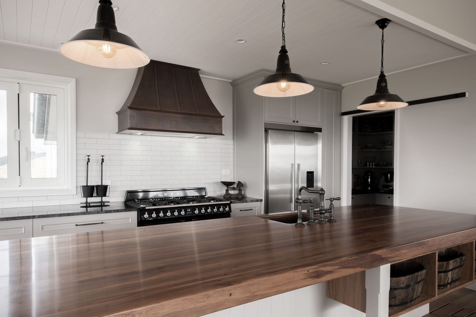 ArchiPro Project Summary - A warm and inviting Heritage Kitchen featuring traditional 5-piece doors, a 2-pot satin lacquer finish, granite and recycled Rimu benchtops, complemented by a stunning hand-beaten copper sink and rangehood.