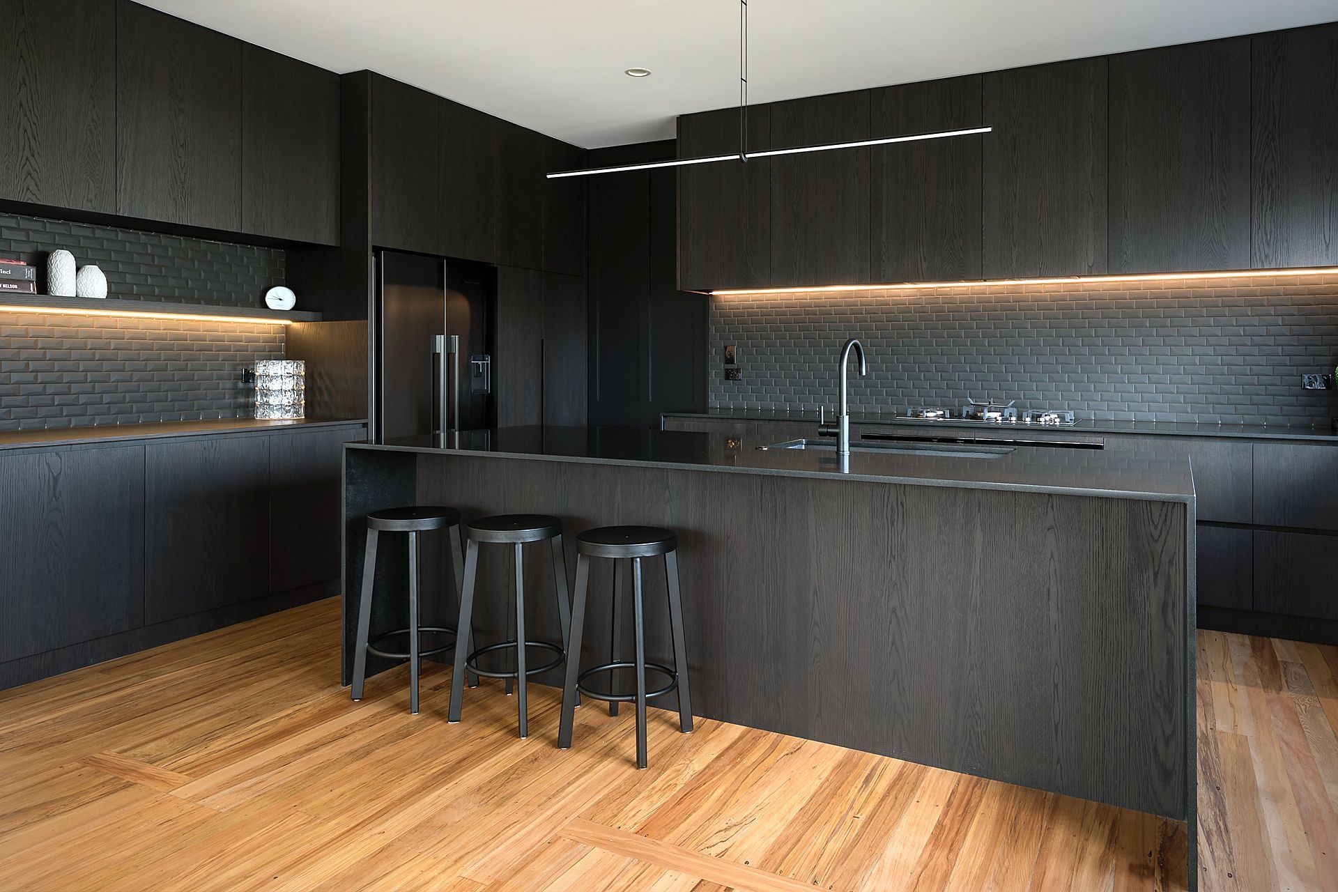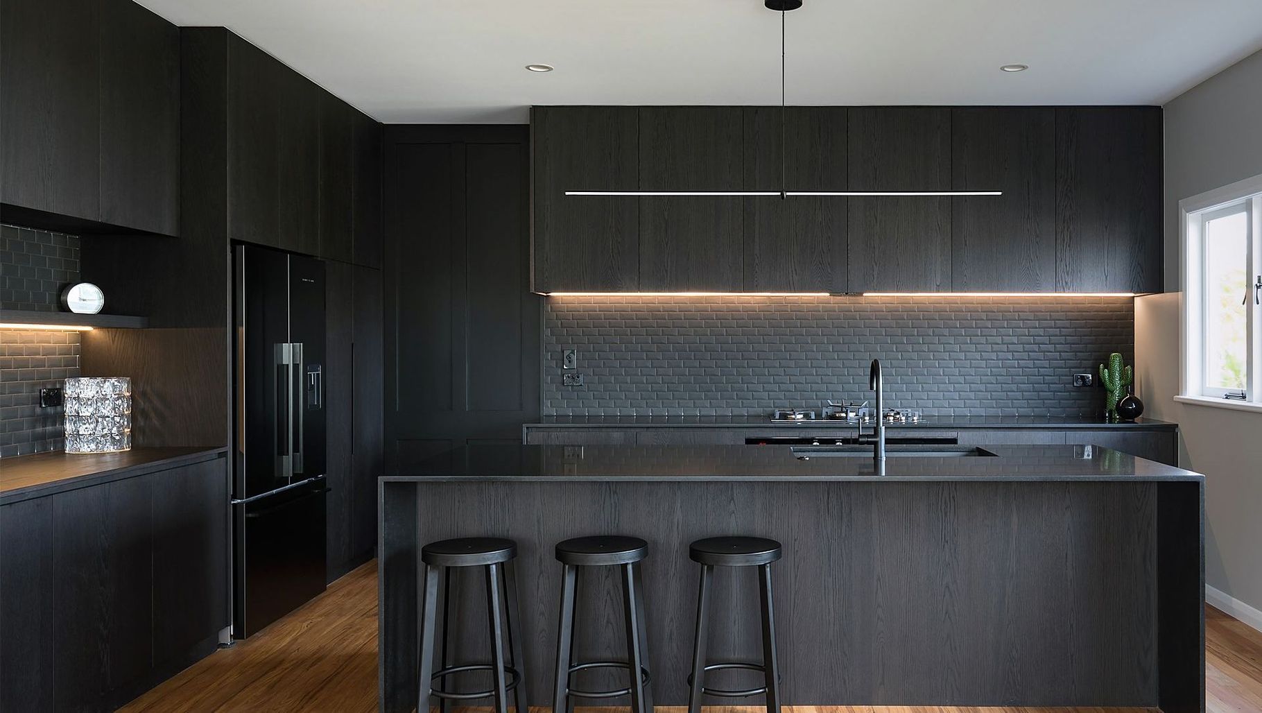ArchiPro Project Summary - A striking all-black kitchen design featuring black wash oak, honed black granite benchtops, and minimalist lines, optimized for storage with ceiling-height cabinets and illuminated open shelving, creating a dramatic yet elegant culinary space.