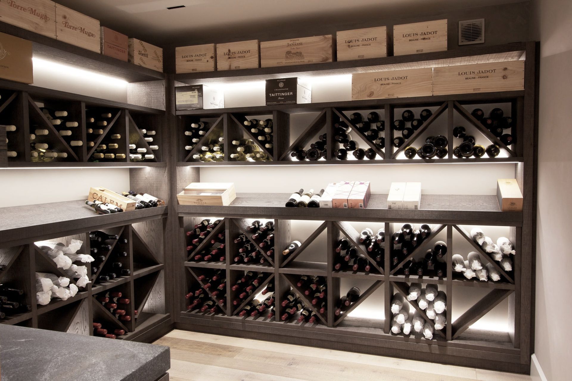 ArchiPro Project Summary - The Herne Bay Wine Cellar features custom shelving and a sophisticated wine rack, showcasing an impressive collection of wine bottles in an inviting retreat.