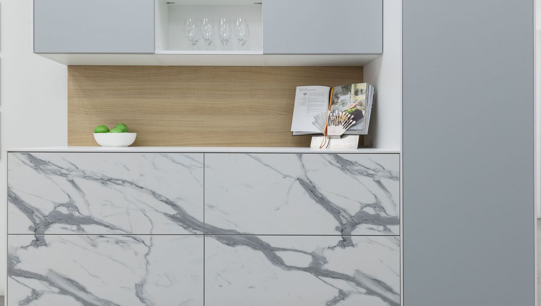 ArchiPro Project Summary - Hettich NZ showroom features elegant Calacutta Grey laminate benchtops paired with Foxy Soft-Matt cabinetry, creating a light and inviting space ideal for high-use areas, including commercial furniture and residential applications.