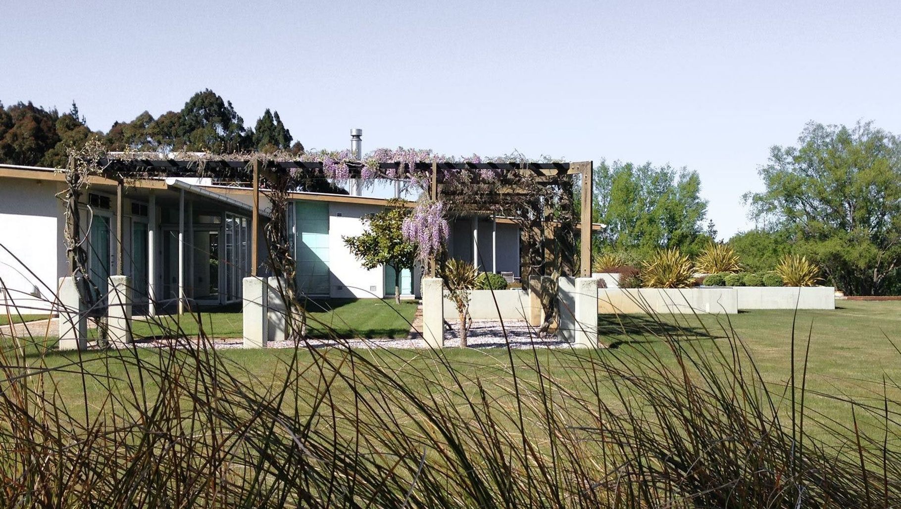 ArchiPro Project Summary - Award-winning home on a former apple orchard, featuring stunning views of Waimea Inlet, seamless indoor-outdoor living, and a diverse planting palette that enhances the landscape while promoting native biodiversity.