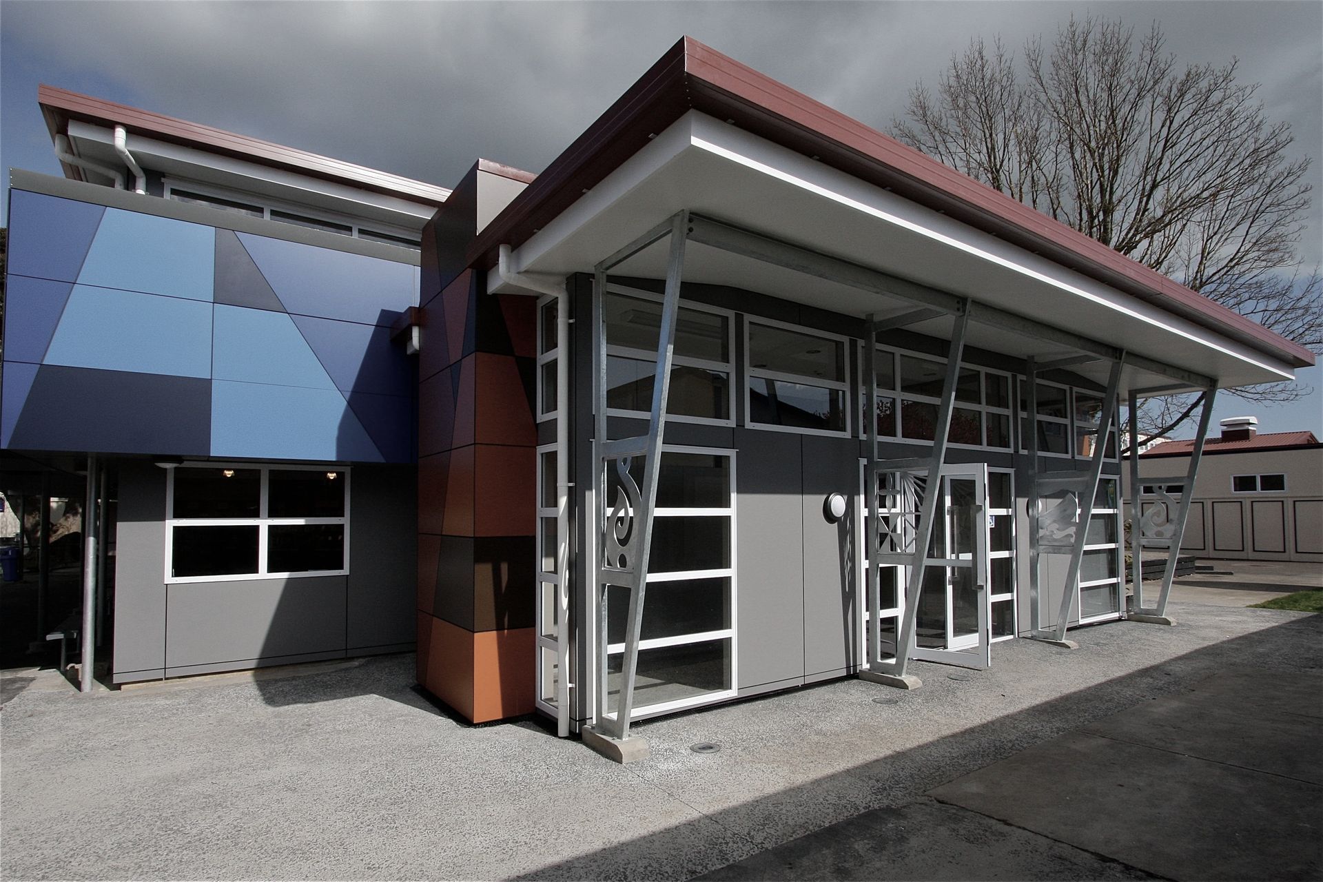 ArchiPro Project Summary - Refurbishment of a 1970s high school library into a vibrant 'Learning Factory' with an industrial aesthetic, featuring colorful Trespa cladding that honors the school's Polynesian heritage and the legacy of James Cook, creating a multifunctional space for learning and events.