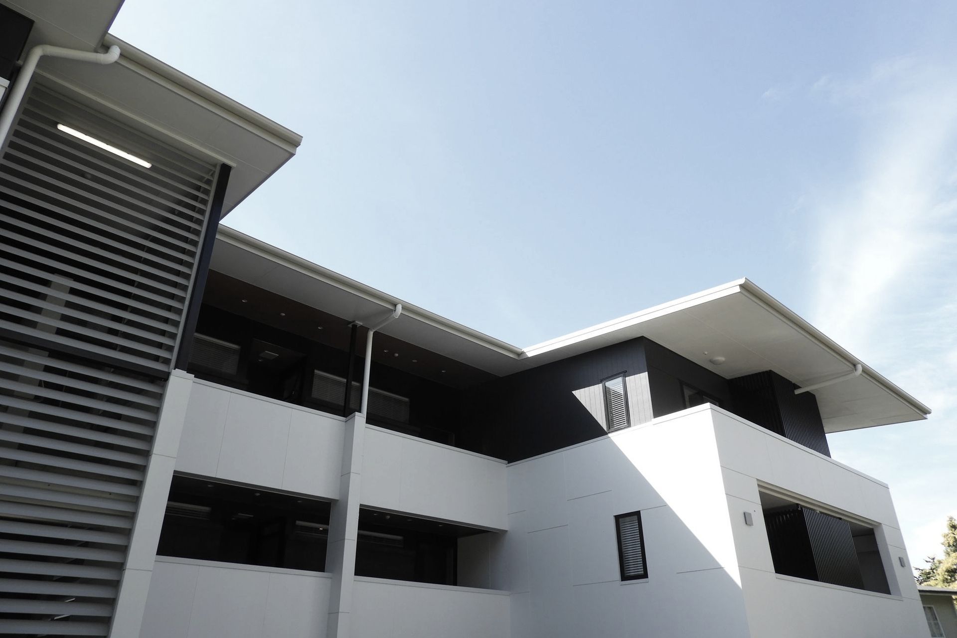 ArchiPro Project Summary - Hillcrest Views: A four-storied apartment block featuring nine luxury apartments with high-end finishes, strategic hillside construction, and stunning views, completed in 2020 for the New Zealand Training Centre.
