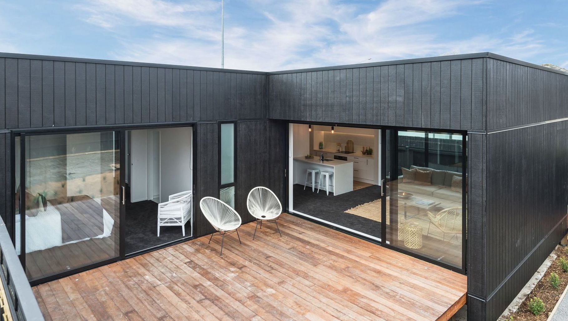 ArchiPro Project Summary - Two stunning new builds featuring shadowclad exteriors and expansive sliding doors that seamlessly connect indoor and outdoor living spaces.