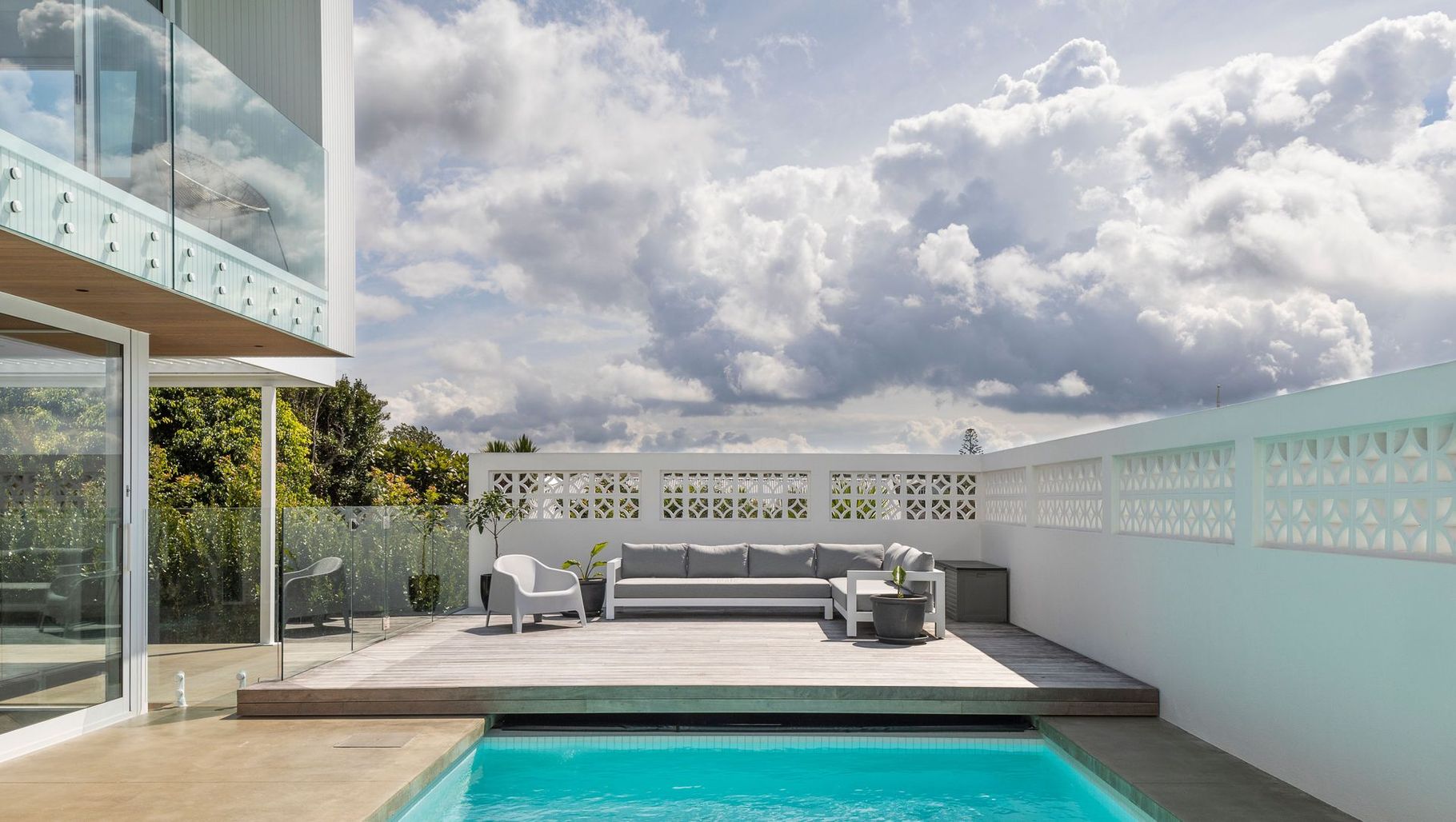 ArchiPro Project Summary - A serene new build in Northcote Point, Auckland, featuring a calming palette of blues, greens, and whites, complemented by cedar, white stone breeze block, and Mid-Century inspired design elements.