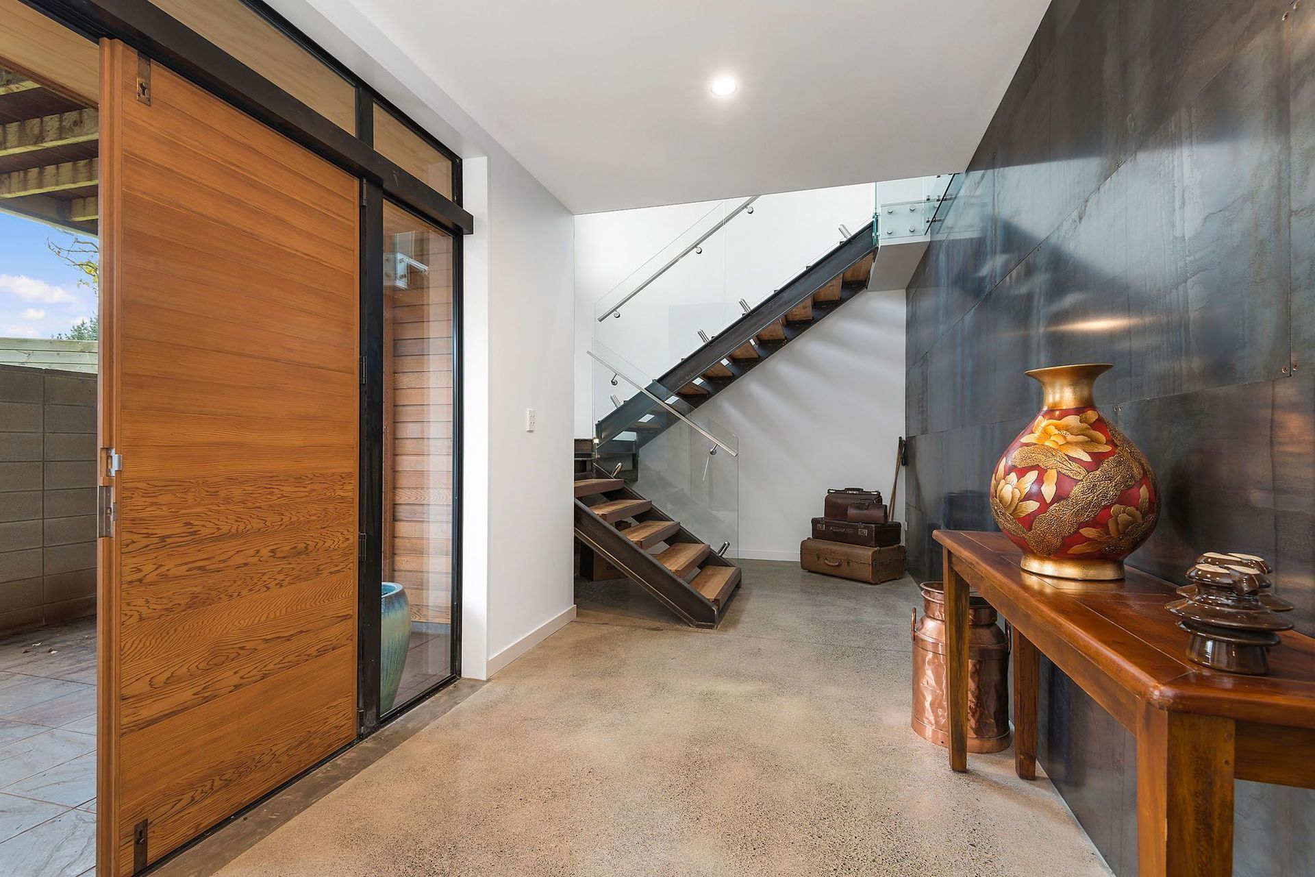 ArchiPro Project Summary - A thoughtfully designed split-level home in Hoon Hay Valley, featuring expansive glass views, distinct living zones, and a harmonious blend of raw materials, all while respecting the site's natural contours and providing ample outdoor entertaining spaces.