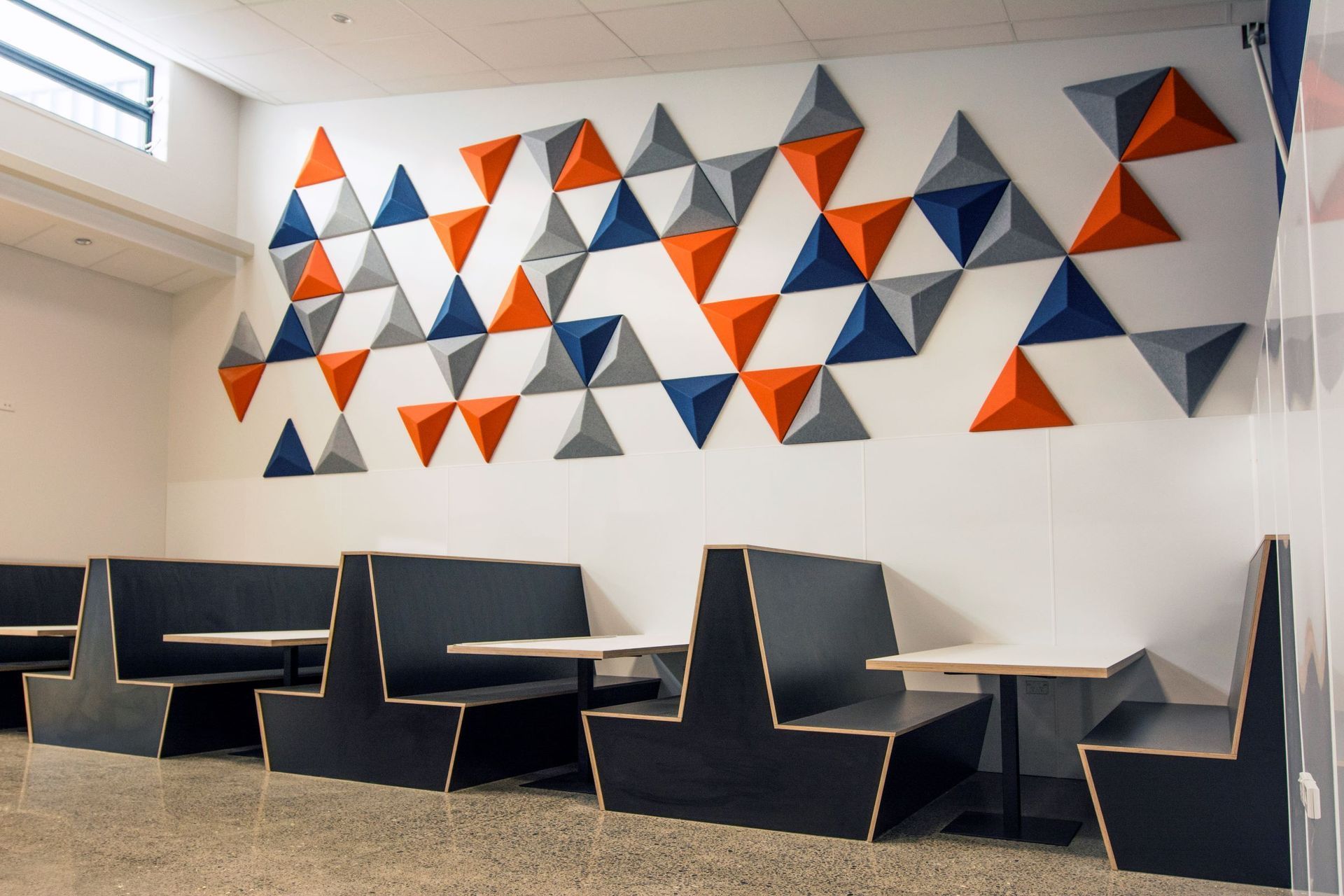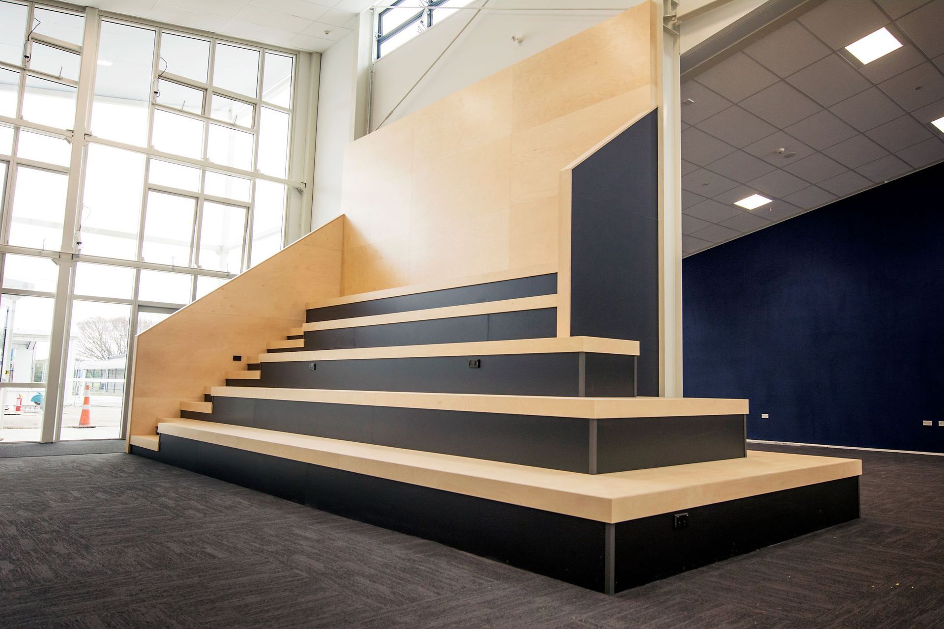 ArchiPro Project Summary - Major rebuild of Hornby High School featuring innovative joinery solutions including reception counters, gym cabinetry, tiered seating, and café booths, all utilizing Plymasters birch ply for a sleek, modern aesthetic.