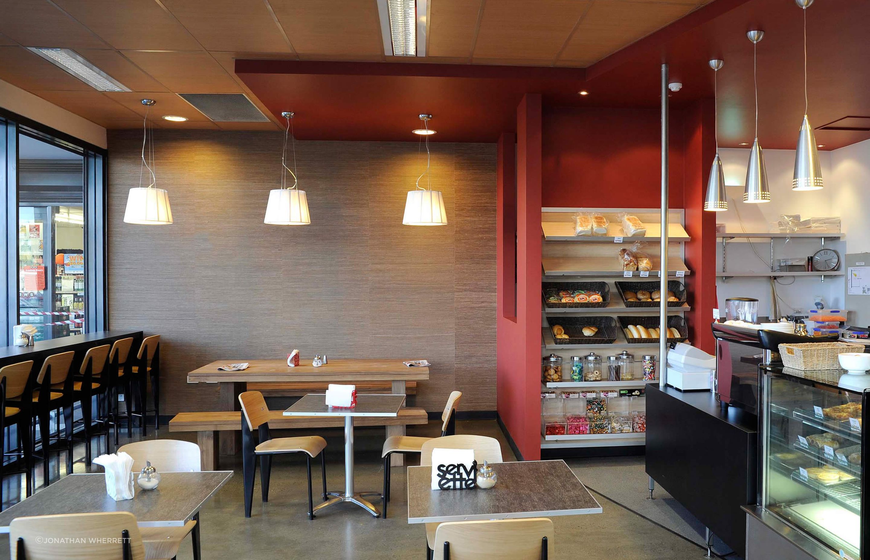 ArchiPro Project Summary - Complete tenancy fit out for Hotshots Cafe, featuring tailored shop layout, colour scheme, and furniture by BYA, alongside logo and graphic design by Cathy McAuliffe Design, including menu board, business cards, and smaller menus.
