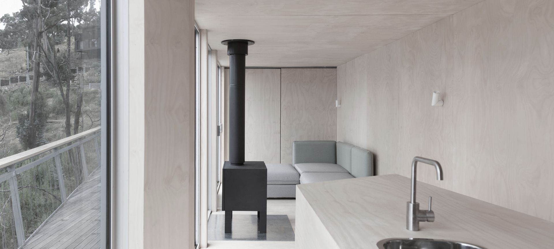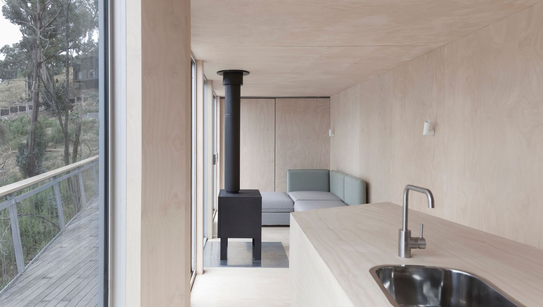 ArchiPro Project Summary - Weekend retreat crafted from shipping containers, featuring a serene interior with DesignerPly surfaces, offering stunning views of the Otway Coast.
