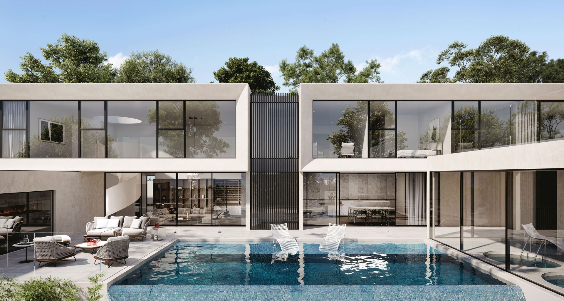 ArchiPro Project Summary - House M showcases fluid lines and a sculptural aesthetic, featuring a dramatic spiral staircase, stone cabinetry, and a harmonious blend of open spaces and natural light, embodying refined luxury and sophistication.