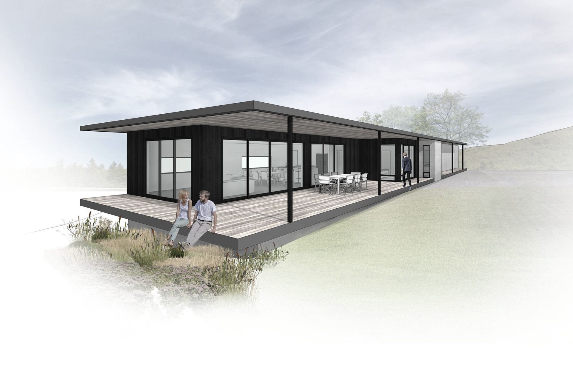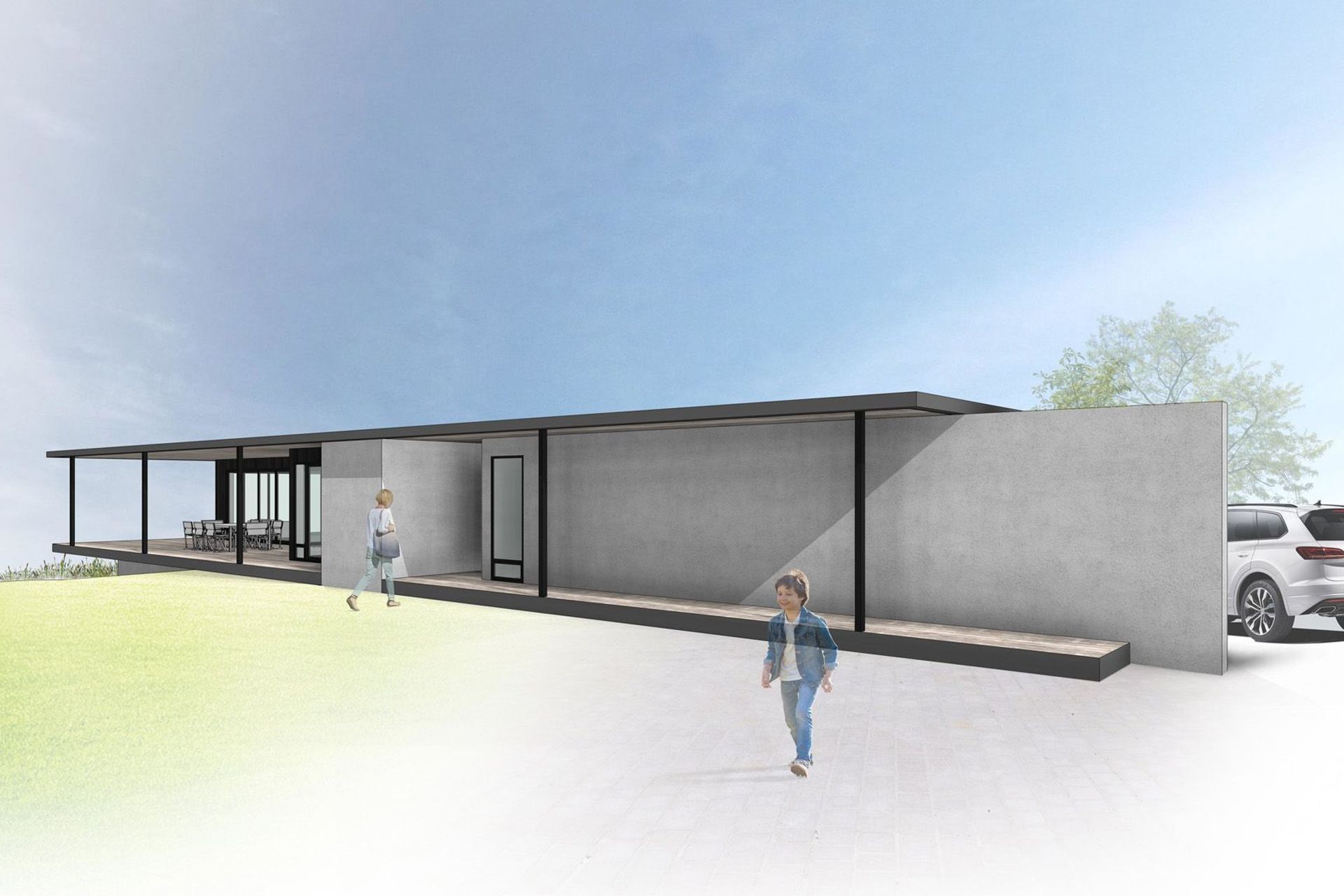ArchiPro Project Summary - A striking Passive House featuring a long linear structure with deep overhangs, designed to blend seamlessly into the hillside while providing stunning valley views and functional outdoor entertaining spaces.