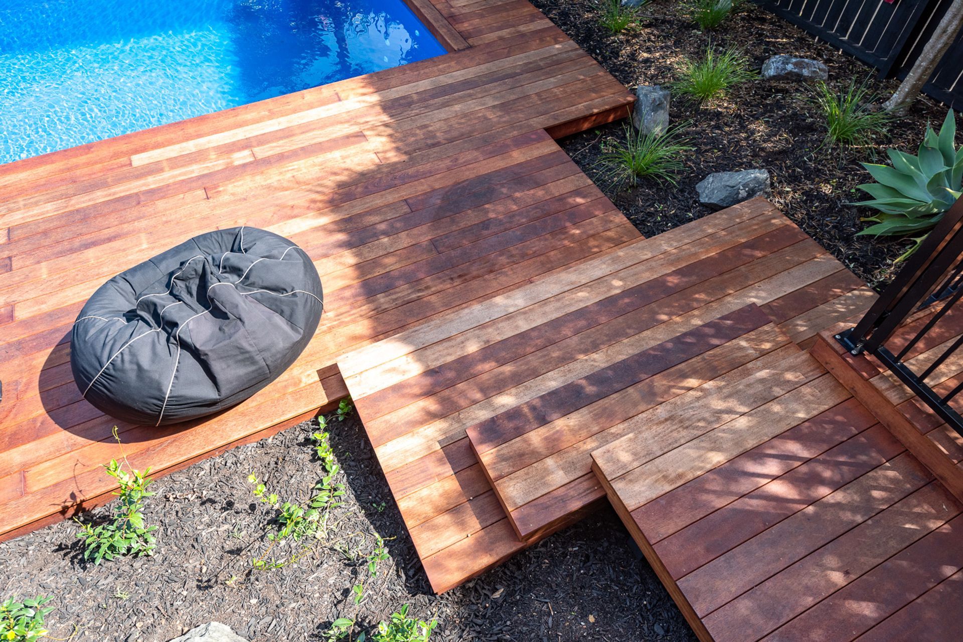 ArchiPro Project Summary - A harmonious blend of natural materials and modern design, featuring a timber deck and luxurious swimming pool.