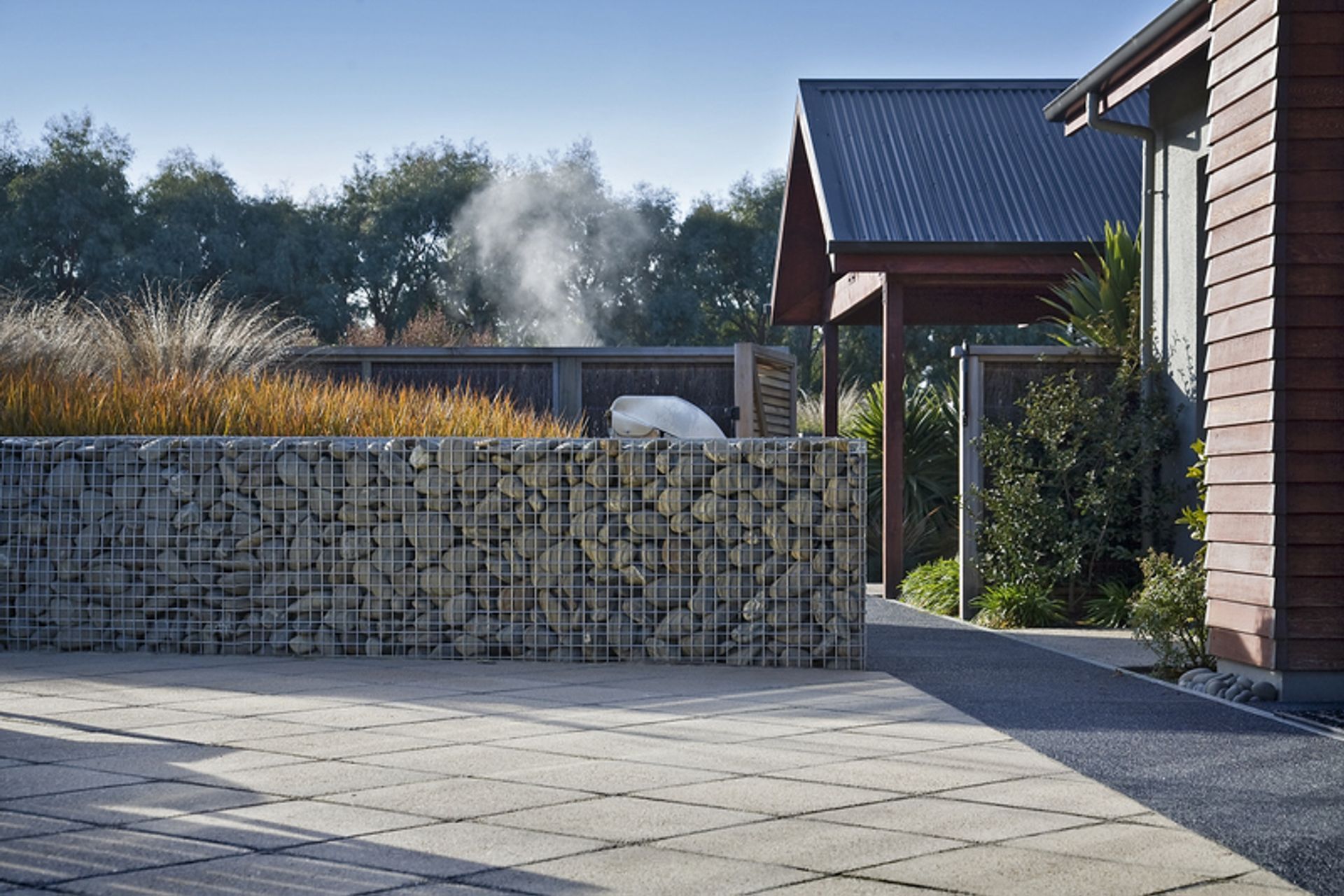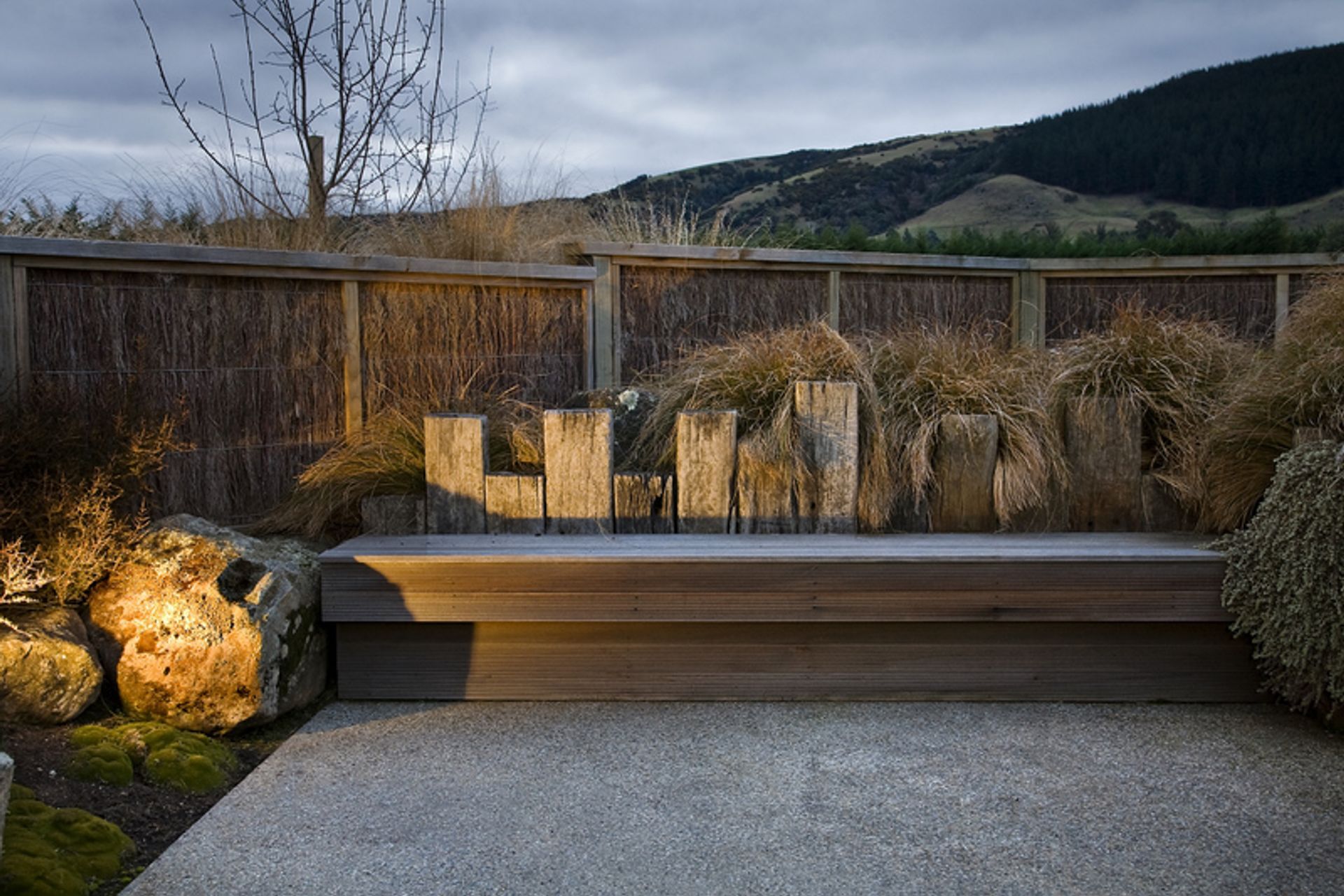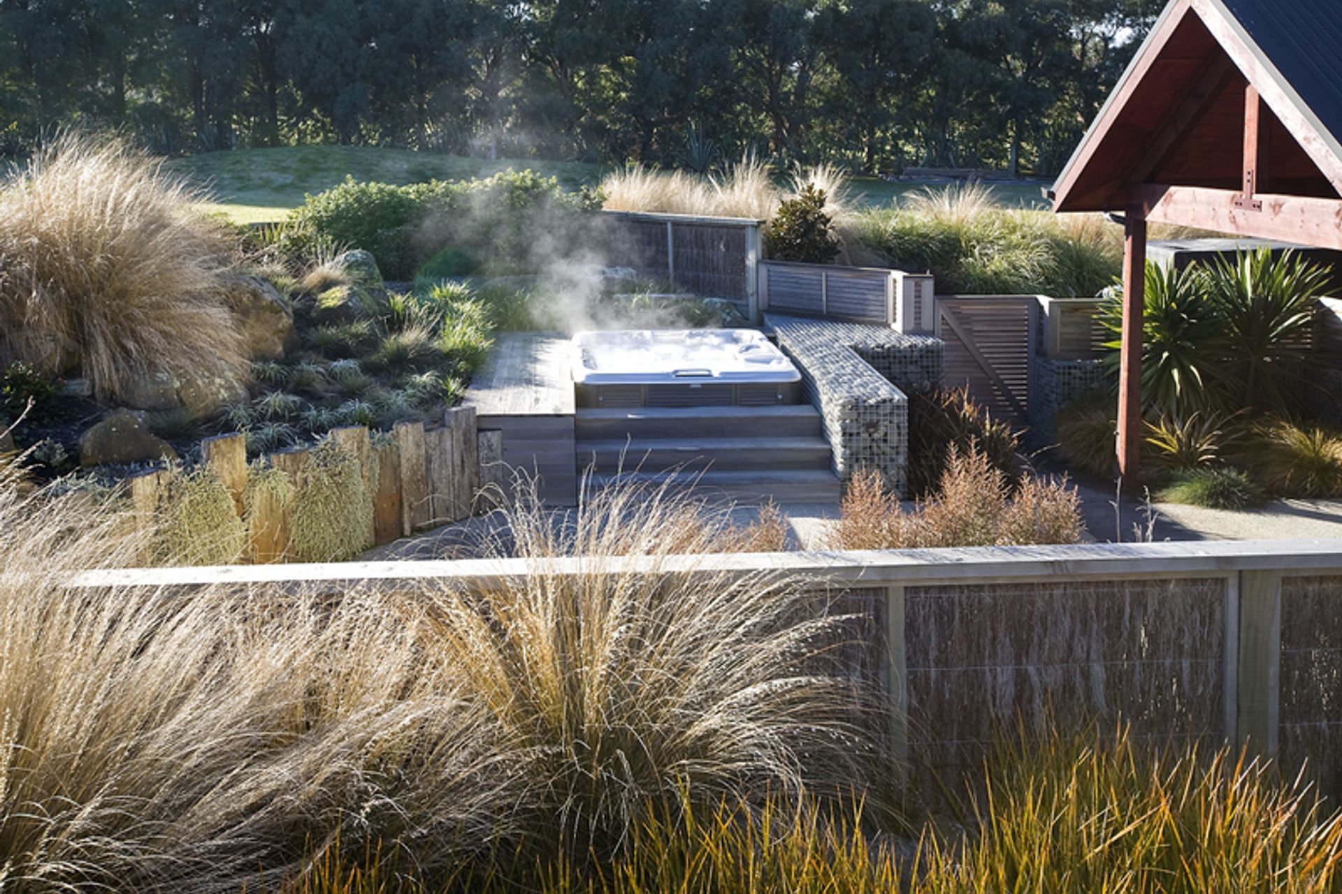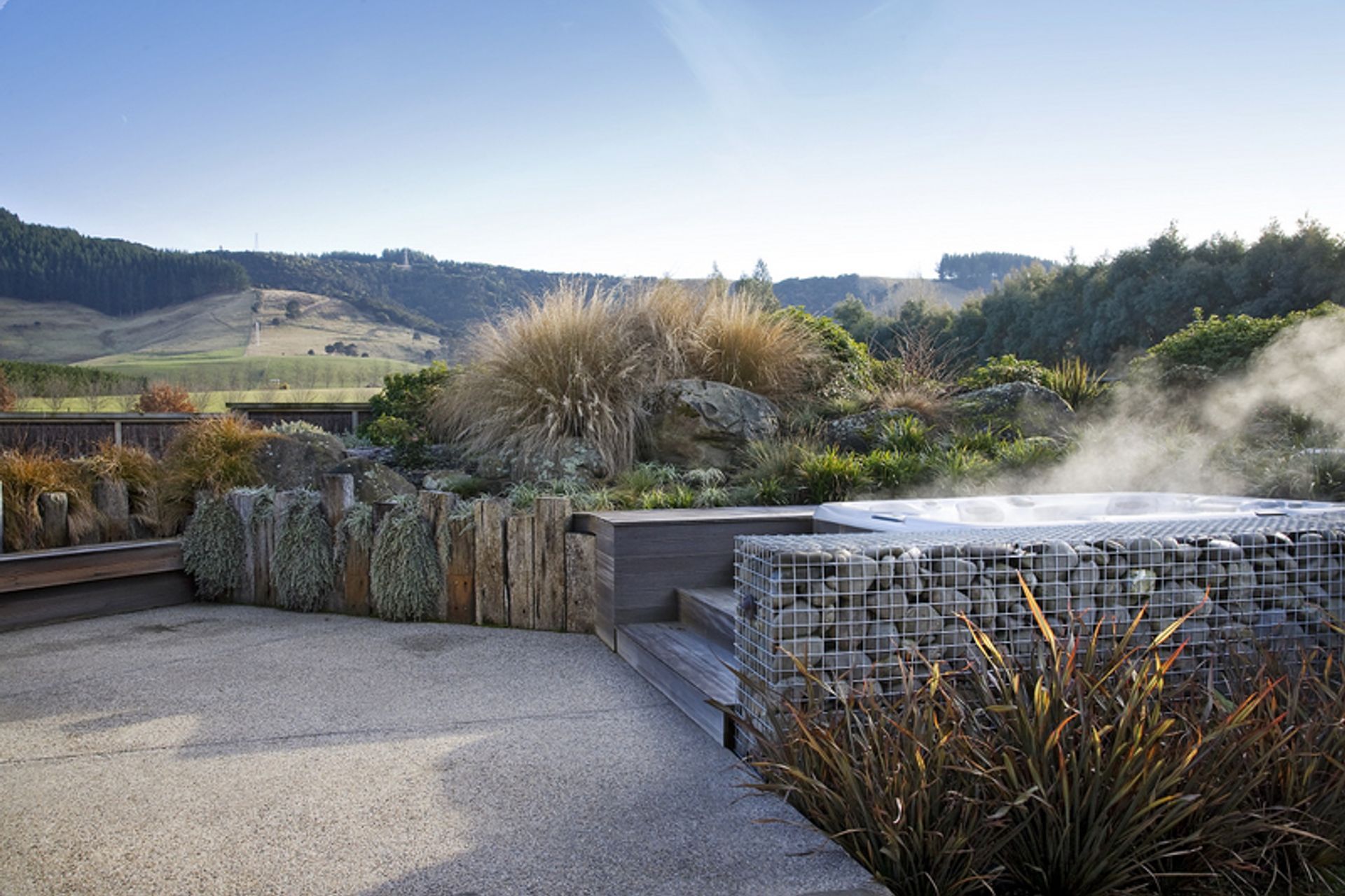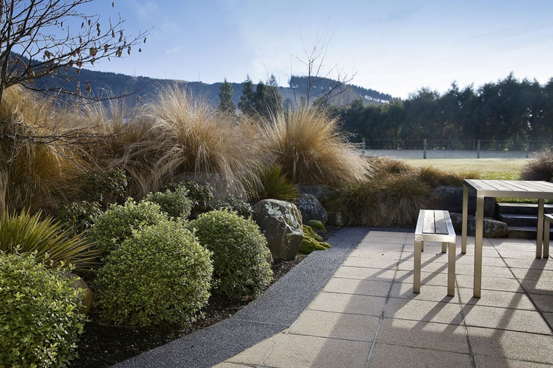ArchiPro Project Summary - Award-winning landscape design that harmoniously integrates a southern lifestyle block with its natural surroundings, featuring innovative materials and a stunning mix of native and exotic plants.