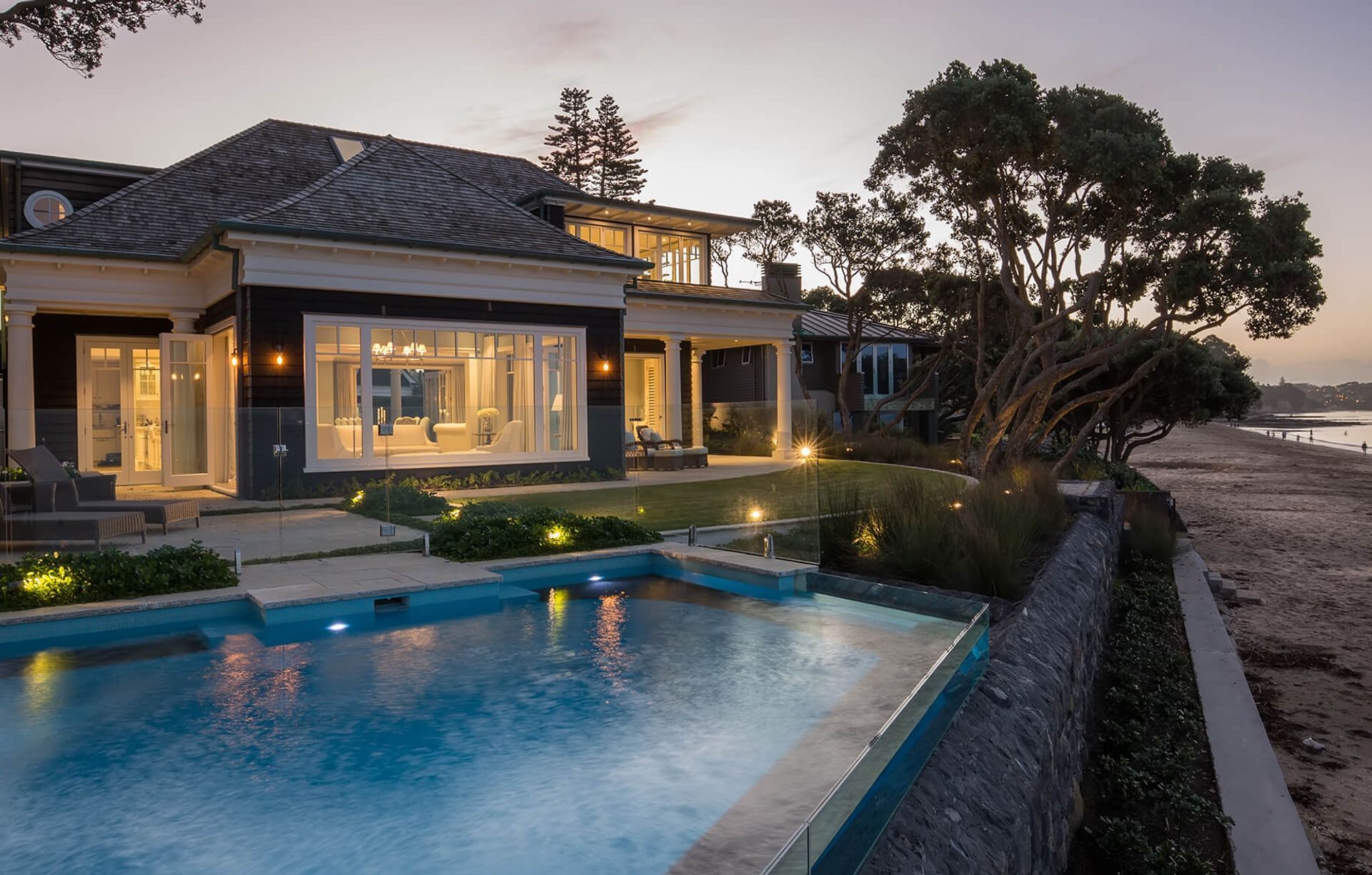 ArchiPro Project Summary - Luxurious Classic Hamptons style home completed in 2016, featuring 5 bedrooms, multiple living areas, and a stunning beachfront pool, designed by Masonry Design Solutions and executed by Richard Davidson Builders, recognized with prestigious craftsmanship awards.