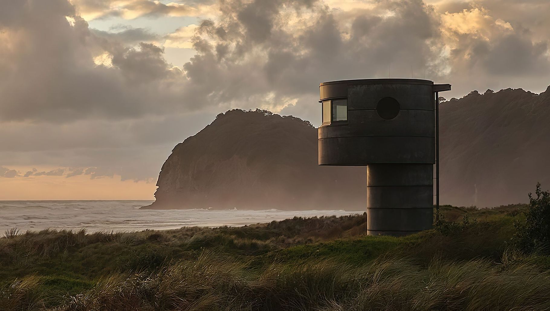 ArchiPro Project Summary - A robust and functional lifeguard tower at North Piha, designed by Crosson Architects, harmoniously reflecting the coastal landscape with durable materials and a design inspired by the surrounding dunes and distinctive black sand.