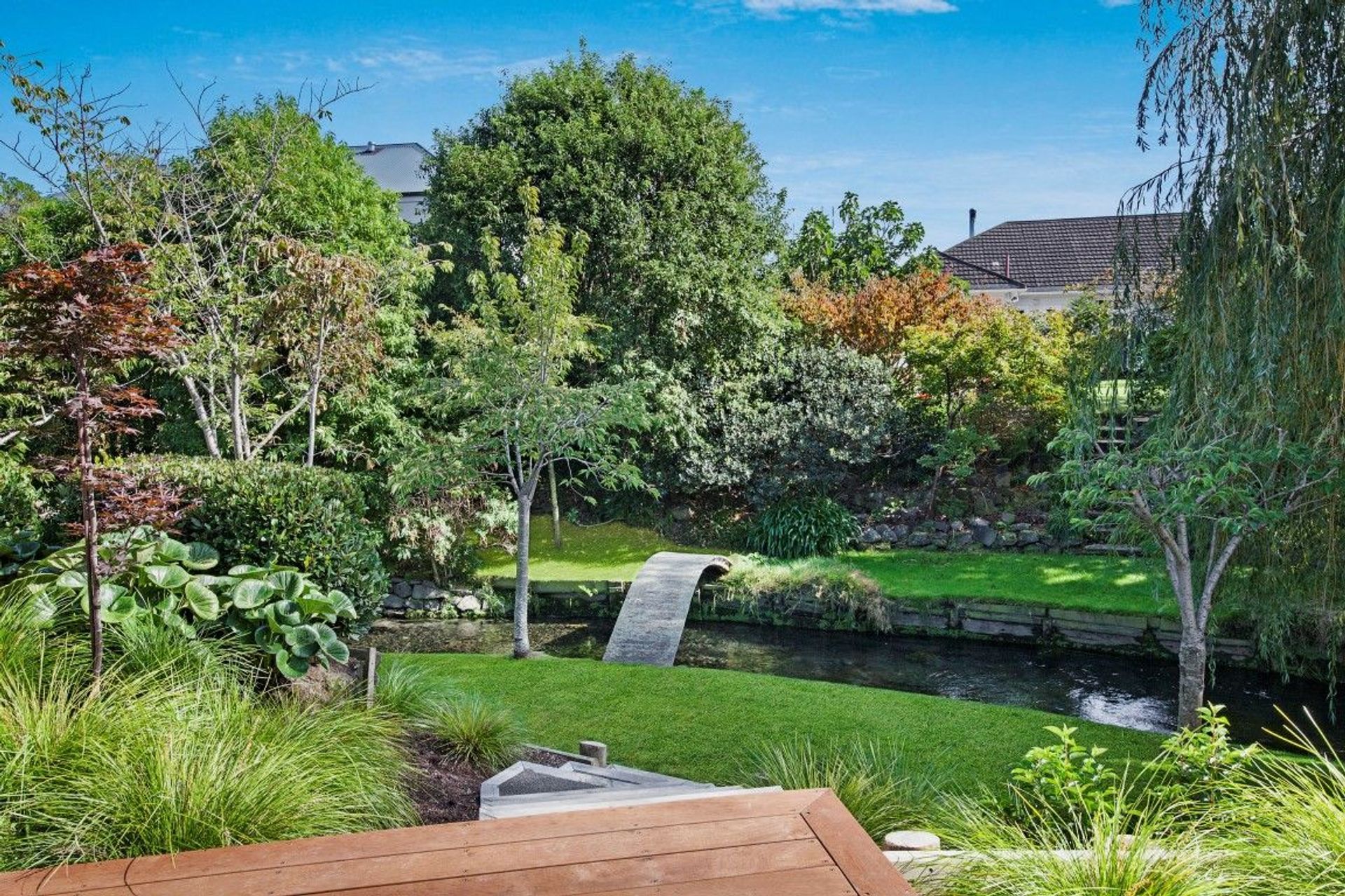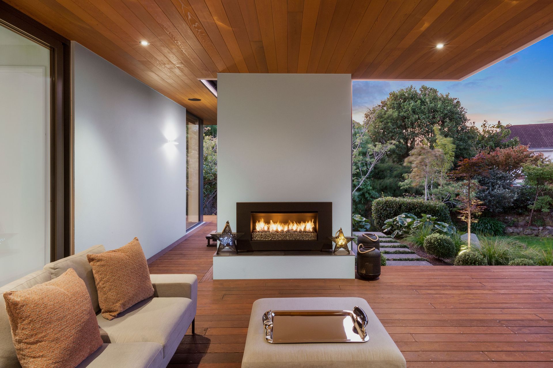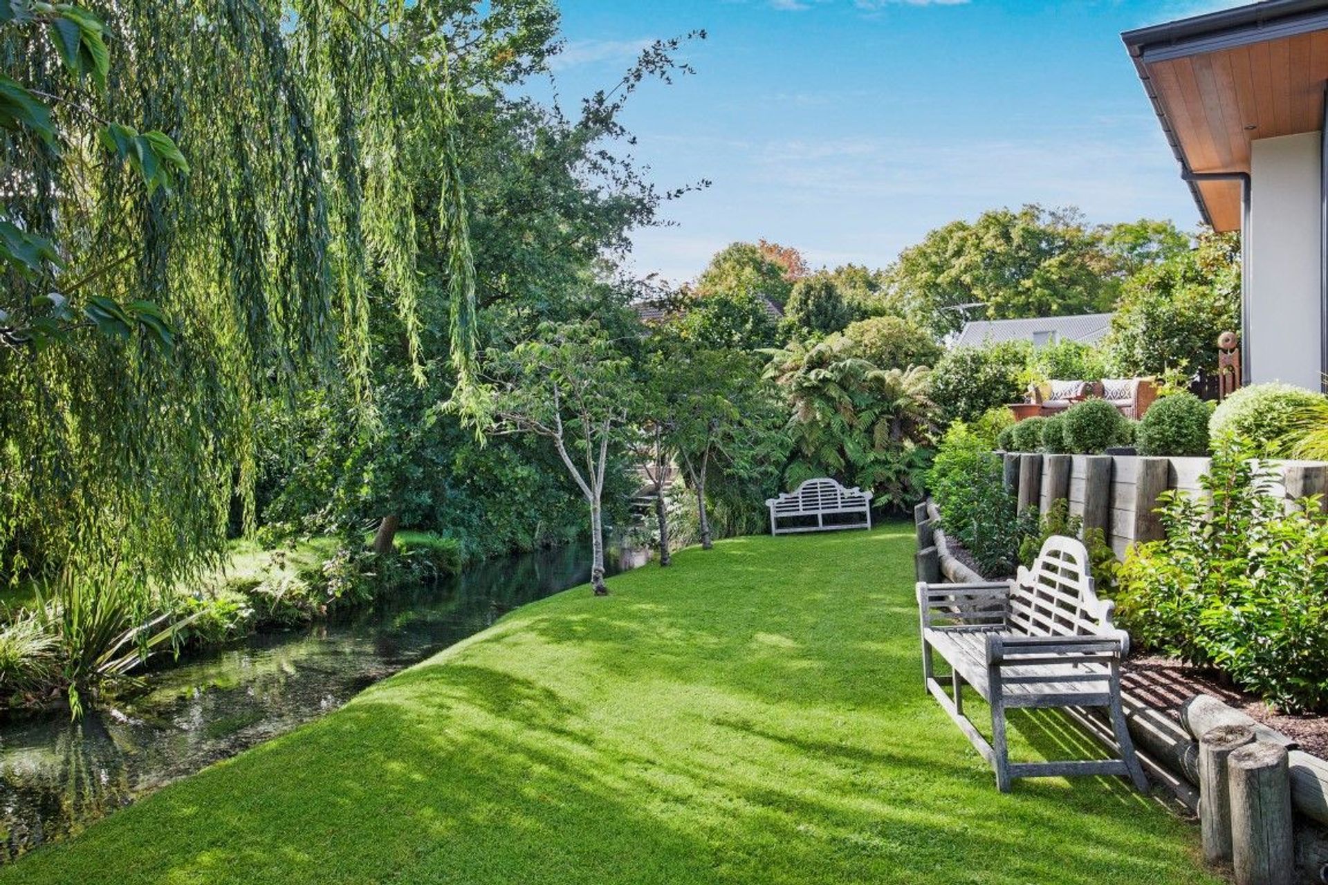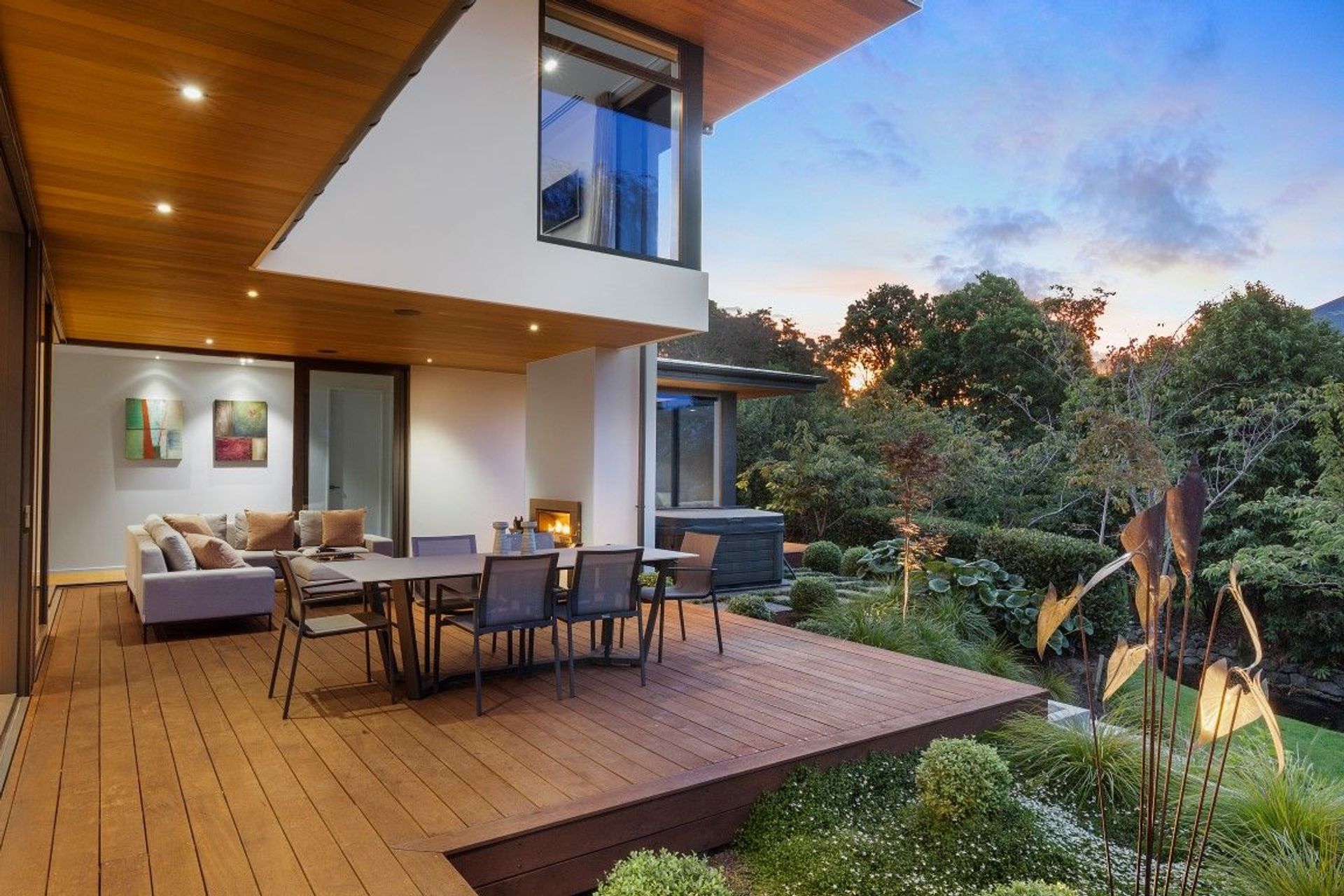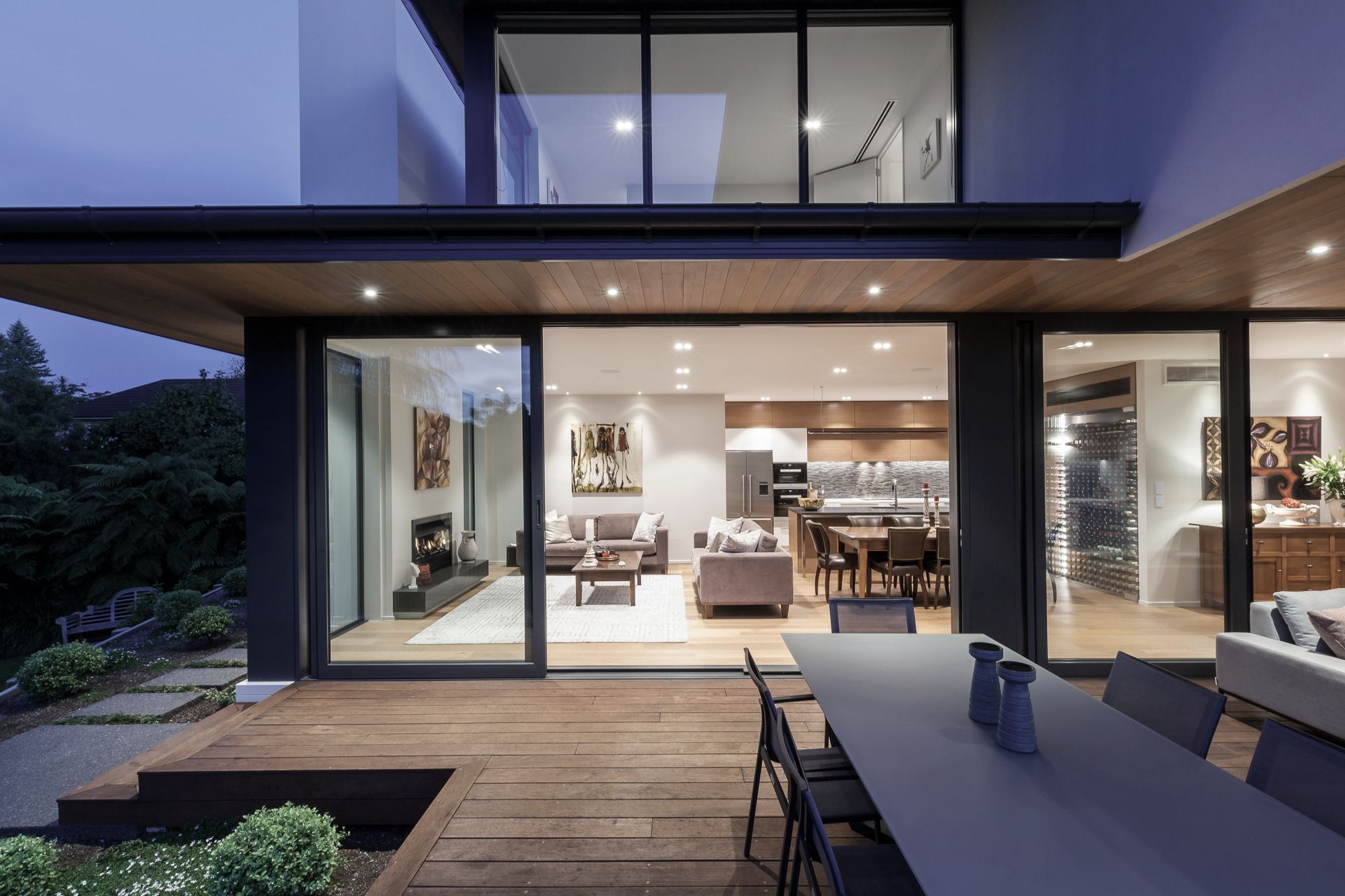 ArchiPro Project Summary - A harmonious blend of indoor and outdoor living, featuring terraced gardens, expansive decking, and a cozy gas fireplace, all set against the picturesque backdrop of the Ilam Stream.