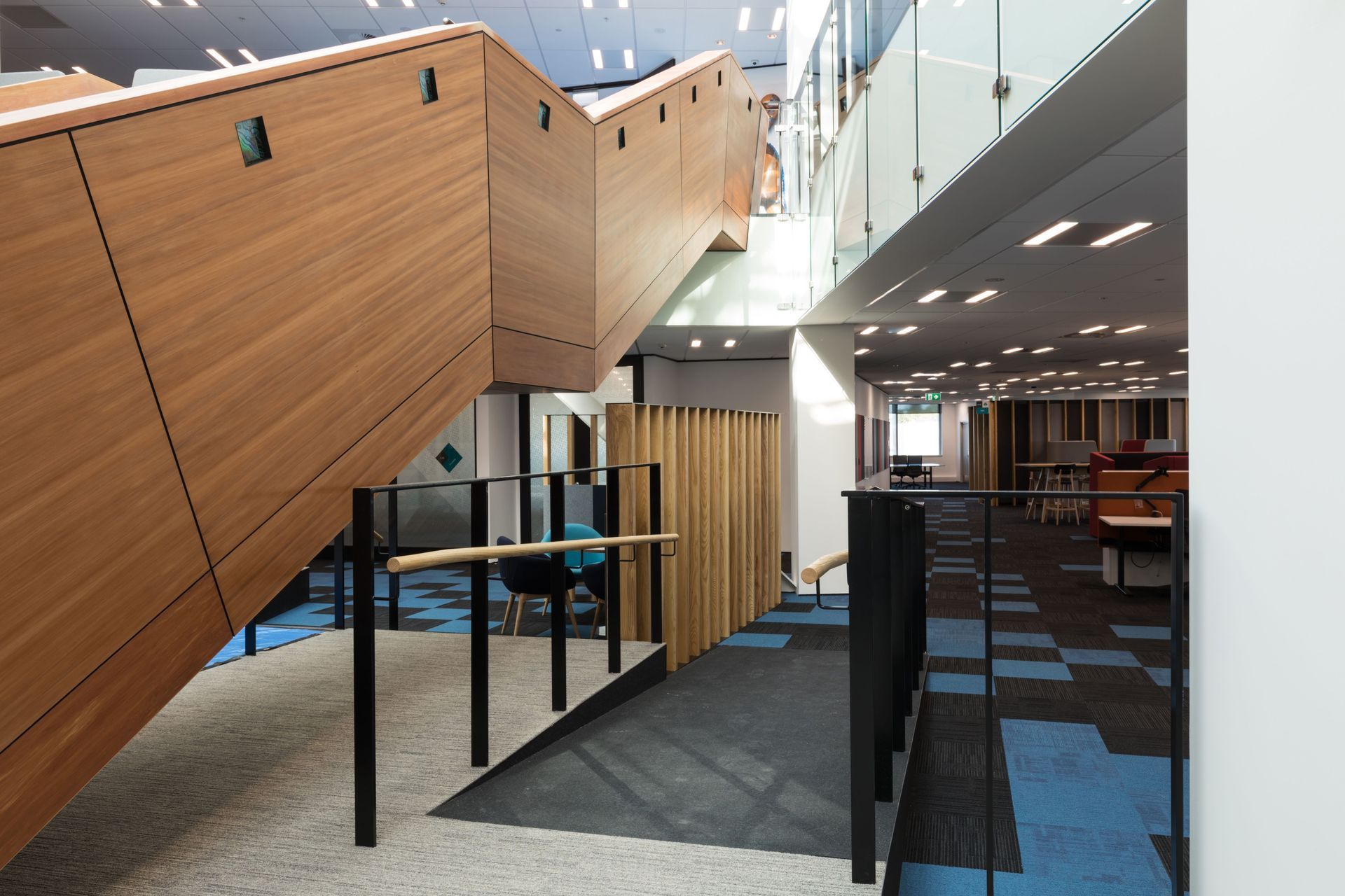 ArchiPro Project Summary - A thoughtfully designed office for Inland Revenue in Te Rapa, Hamilton, integrating the surrounding landscape, Waikato River, and Maori culture, featuring a two-floor layout connected by a naturally lit central hub and stairway.