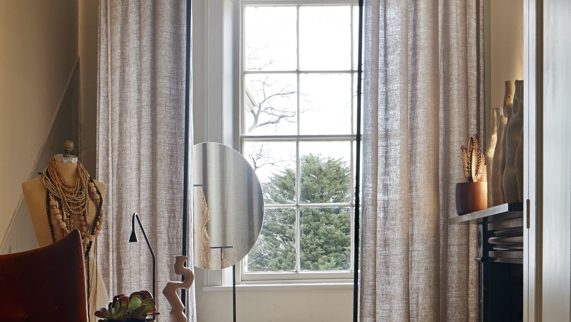 An ingenious changing area complete with flowing linen curtains is created (with a nod to the Victorian circular shower screen) that allows for complete privacy during the dress/undress process. A perfectly placed round feature mirror sits ready for detailed examinations of the outfits in question. Whilst the pieces are clearly contemporary in material and colour palette, they coexist with the strong Victorian bones of the room.