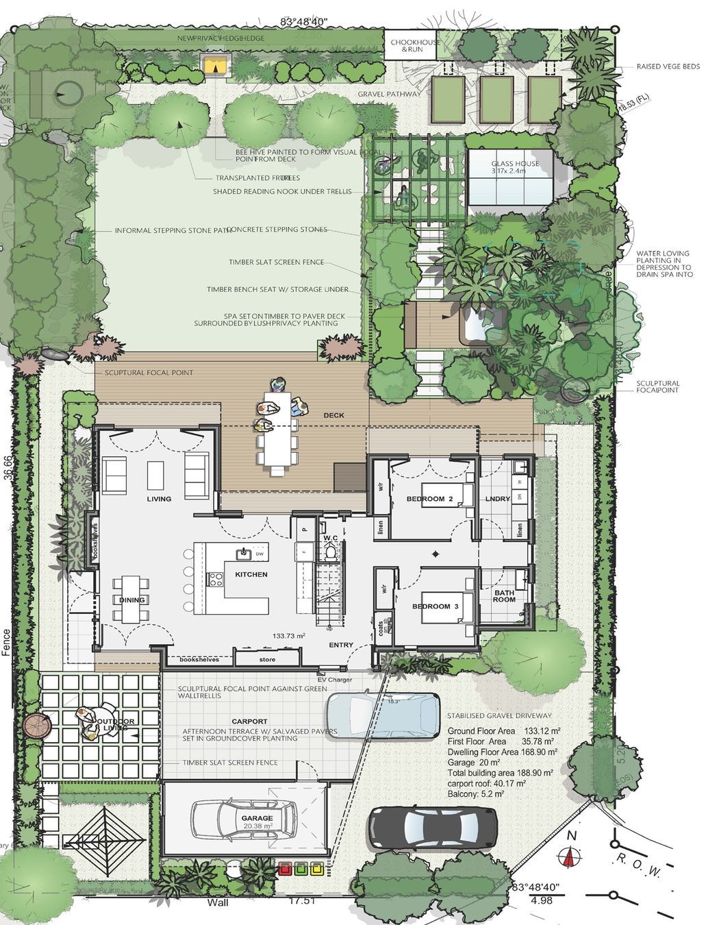 ArchiPro Project Summary - A sustainable three-bedroom dwelling featuring a seamless indoor-outdoor connection, energy-efficient systems, and a central entertainer's kitchen, all set within a lush garden environment.
