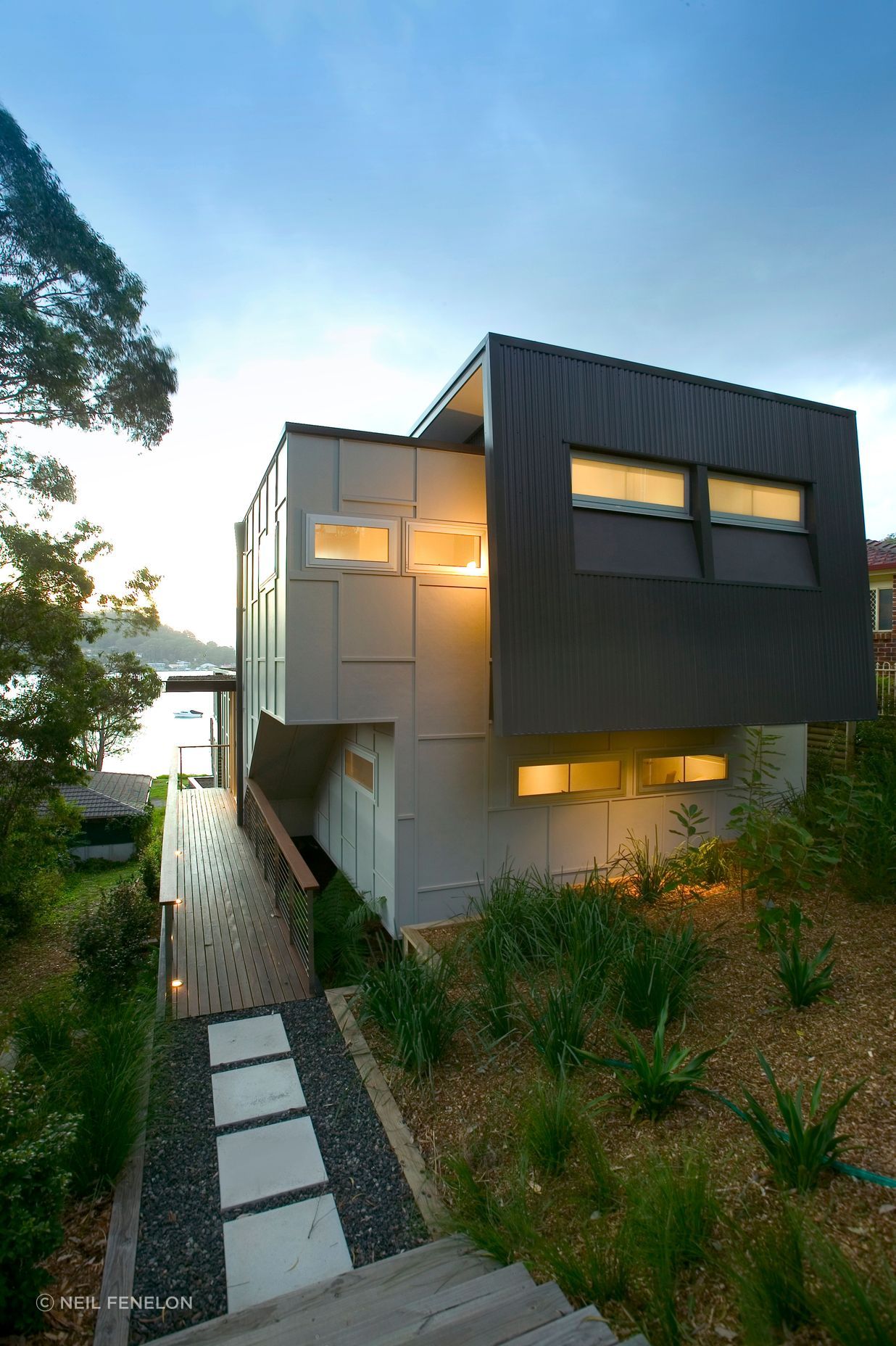 ArchiPro Project Summary - Innovative design of Jetty House features a long, lightweight form that harmonizes with its steeply sloping site, maximizing views and natural light while utilizing a blend of materials to create a striking yet functional living space.