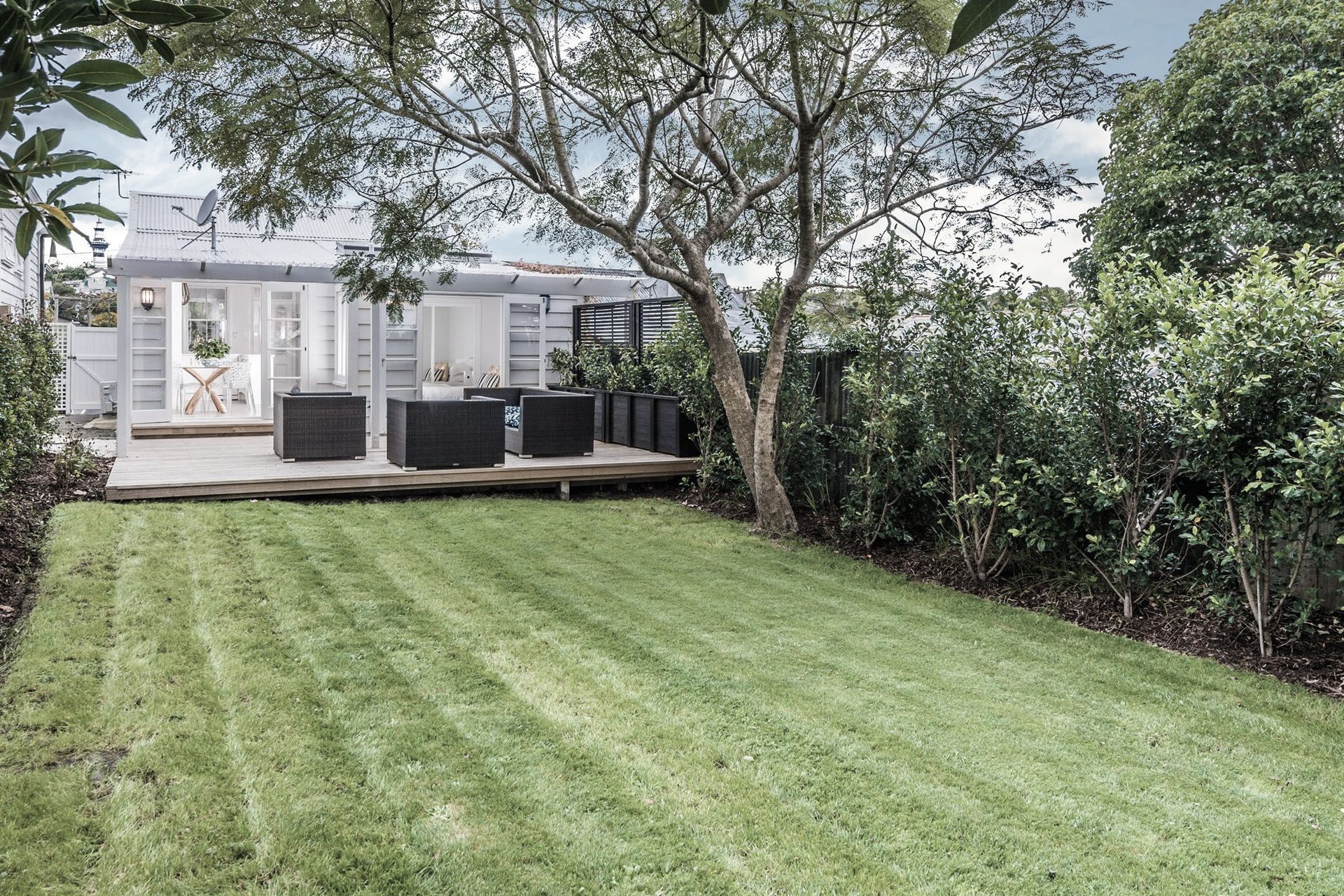 ArchiPro Project Summary - The John Street Home project features a beautifully designed backyard with lush gardens, vibrant plants, and a serene lawn, creating an ideal retreat for relaxation and entertainment.