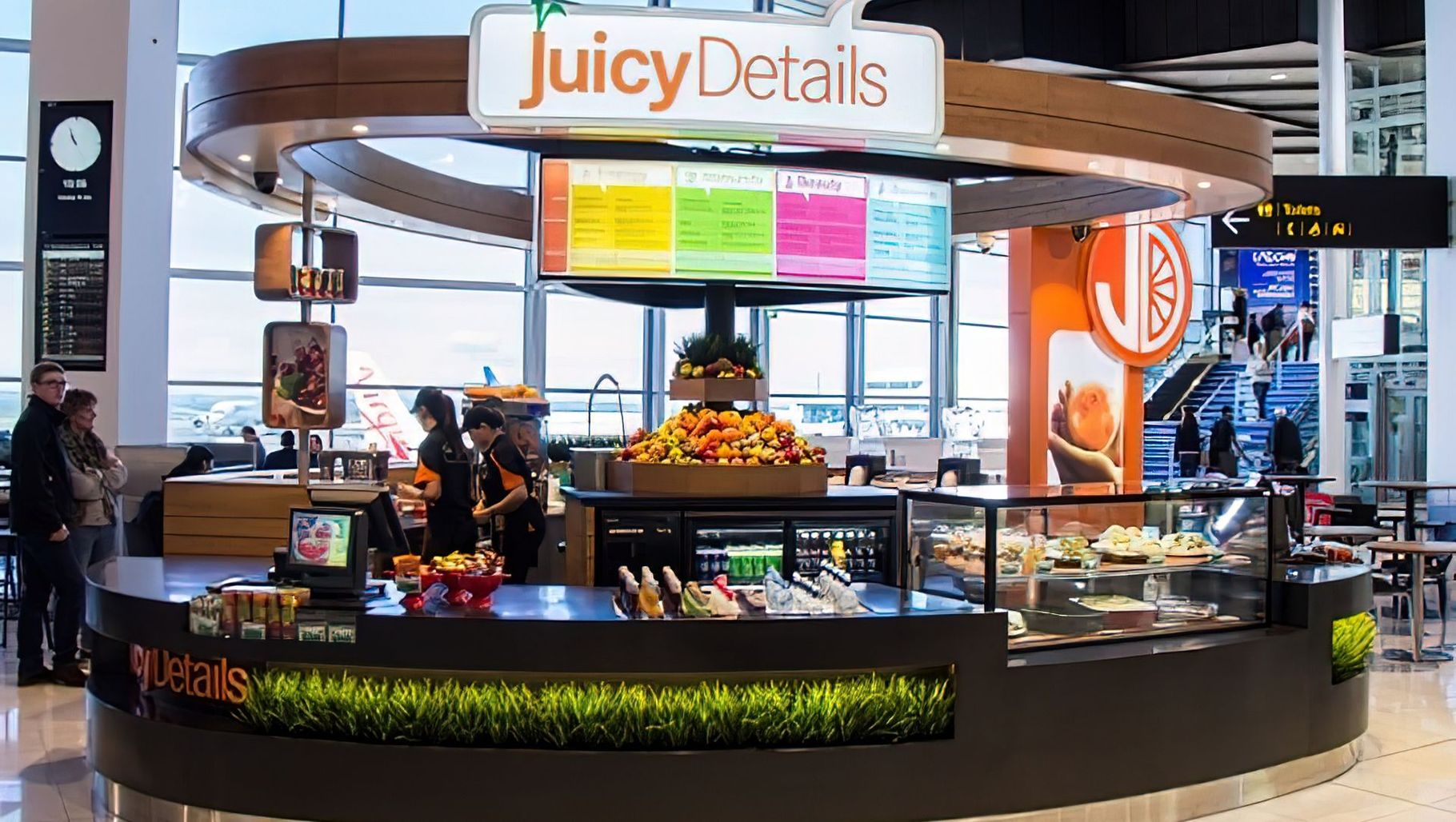 ArchiPro Project Summary - JUICY Details kiosk features vibrant graphic imagery and fresh produce displays, creating an engaging customer experience with a focus on freshness and quality in grab-and-go offerings.