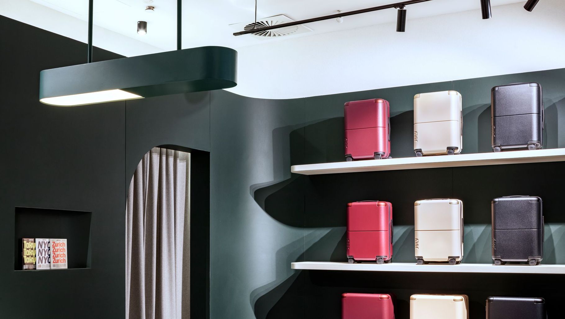 ArchiPro Project Summary - A vibrant exploration of shape and color, July Emporium features a striking cantilevered design that transforms the point of sale into a focal point, while durable linoleum enhances the luggage display, creating an engaging and playful retail environment.