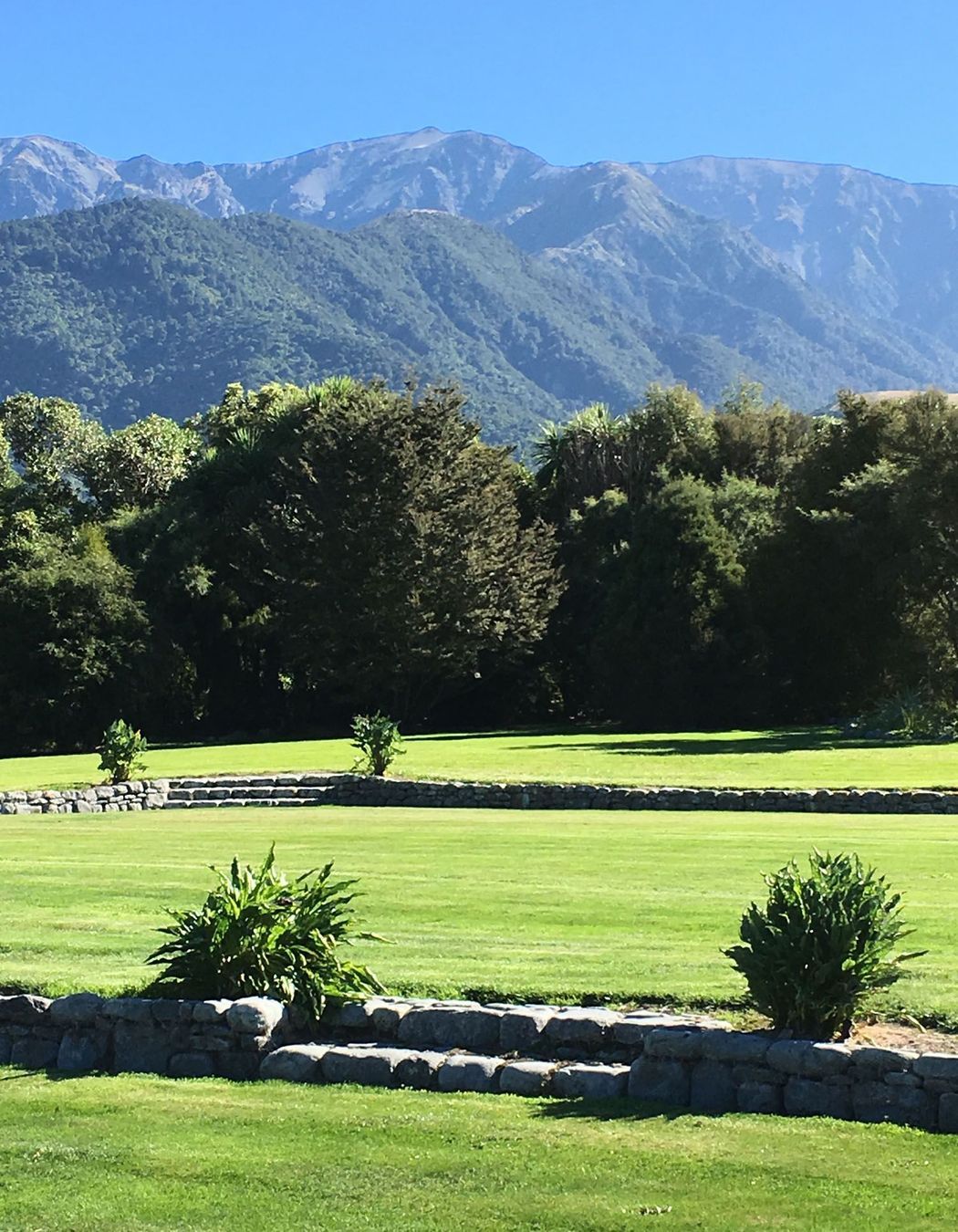 ArchiPro Project Summary - A stunning lifestyle property in Kaikoura featuring minimal landscape design, sweeping lawns, and local stone walls, complemented by a sheltered courtyard with built-in seating and an outdoor fire, all set against the breathtaking backdrop of the Kaikoura ranges.