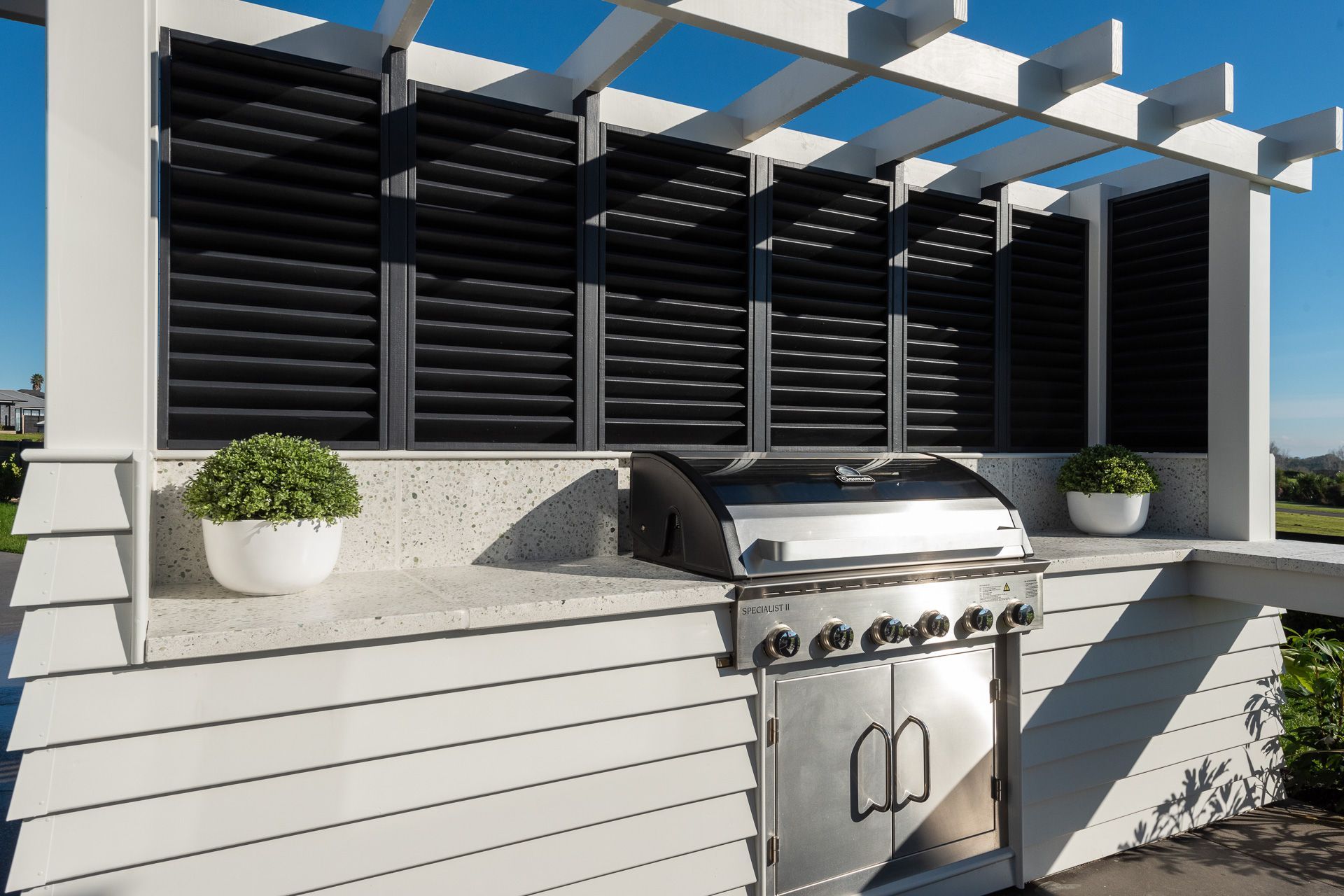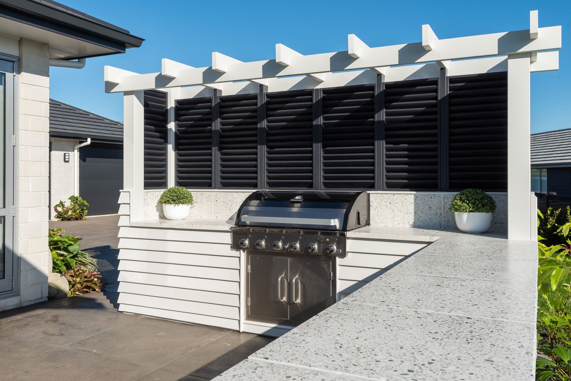 ArchiPro Project Summary - Custom outdoor entertainment area featuring a bespoke BBQ and sheltering shutters, designed to harmonize with the existing architecture for year-round enjoyment.