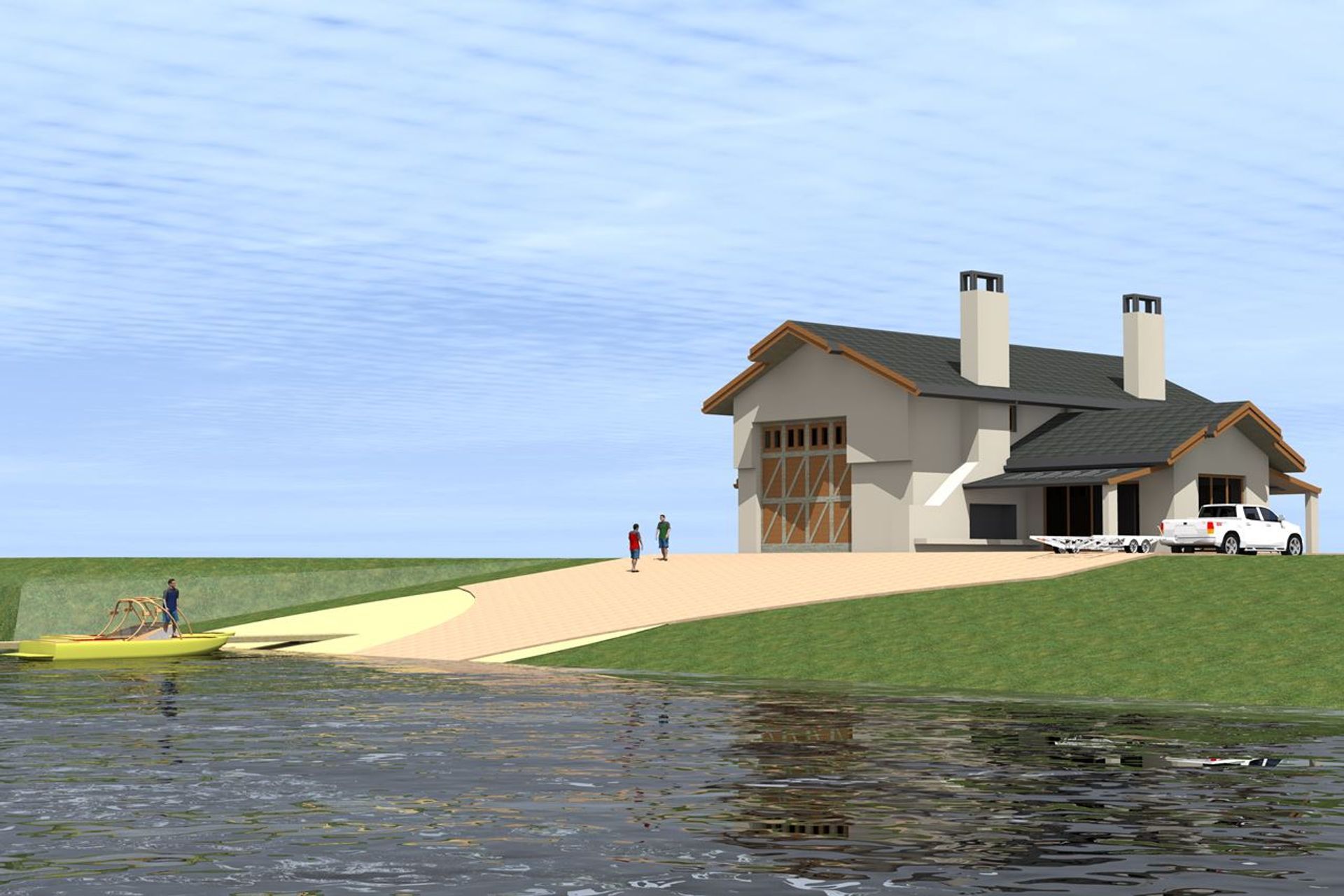 ArchiPro Project Summary - A multi-functional boathouse designed for water-sport enthusiasts, featuring durable Porotherm construction, energy-efficient triple-glazed windows, and a commitment to natural indoor air quality, all set on a unique property with direct water access.