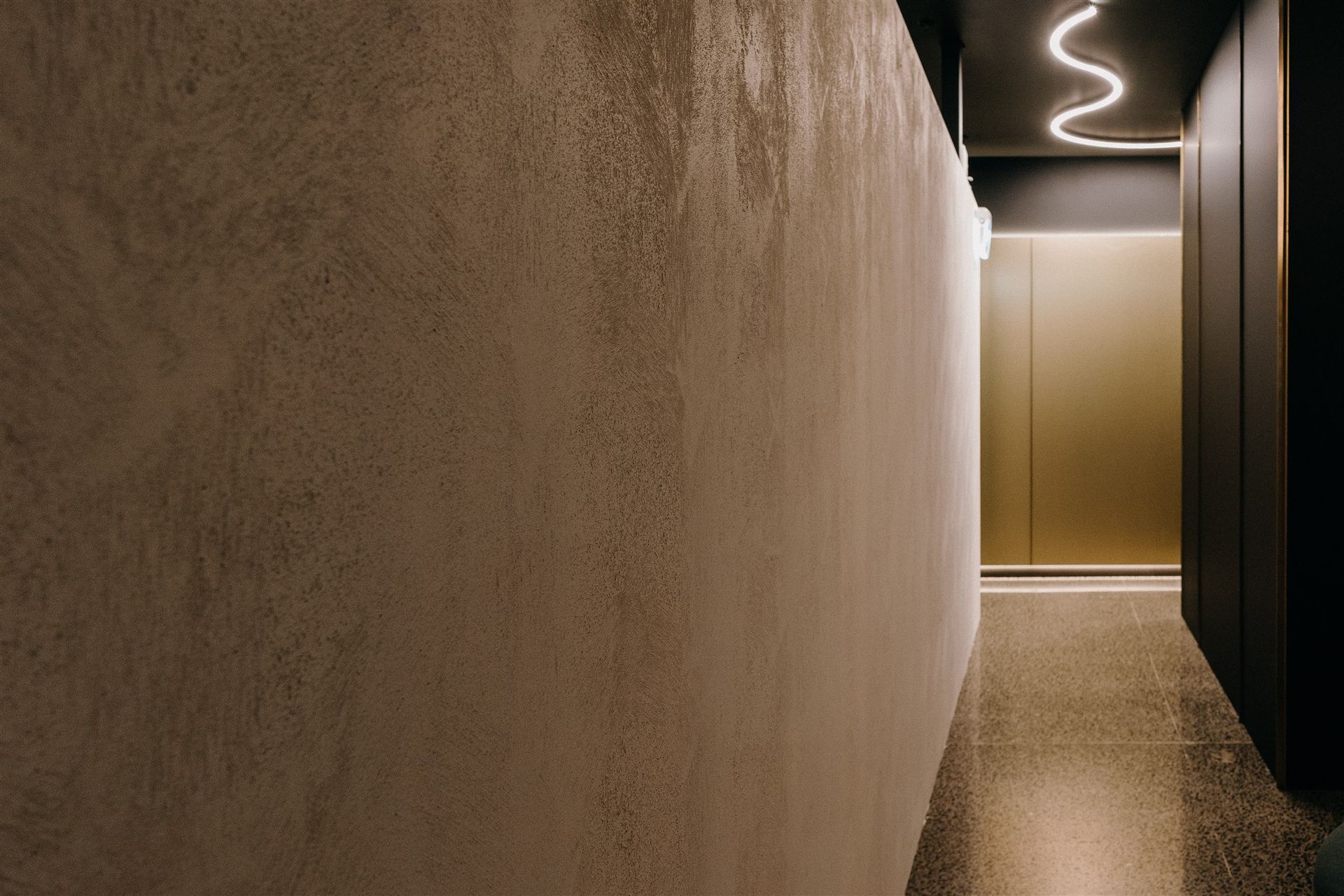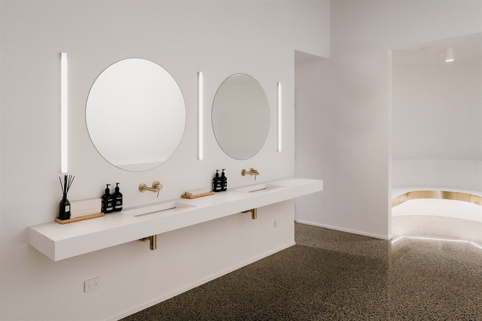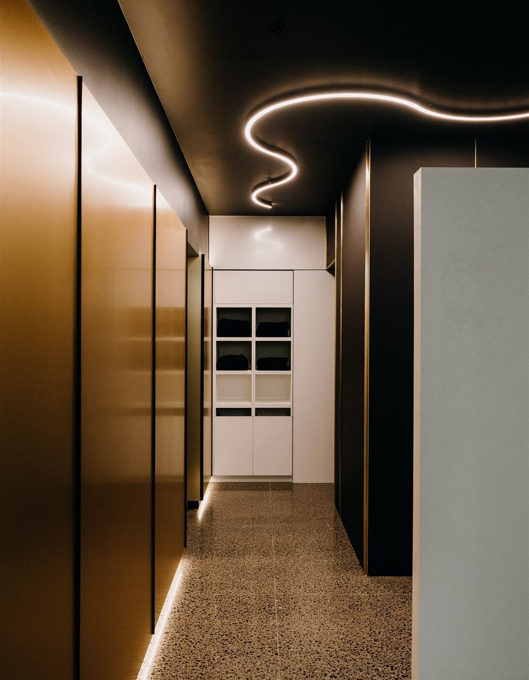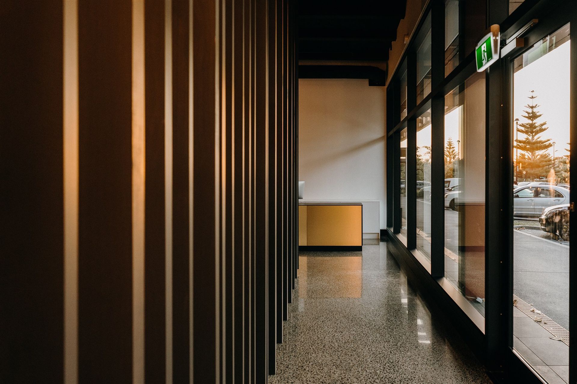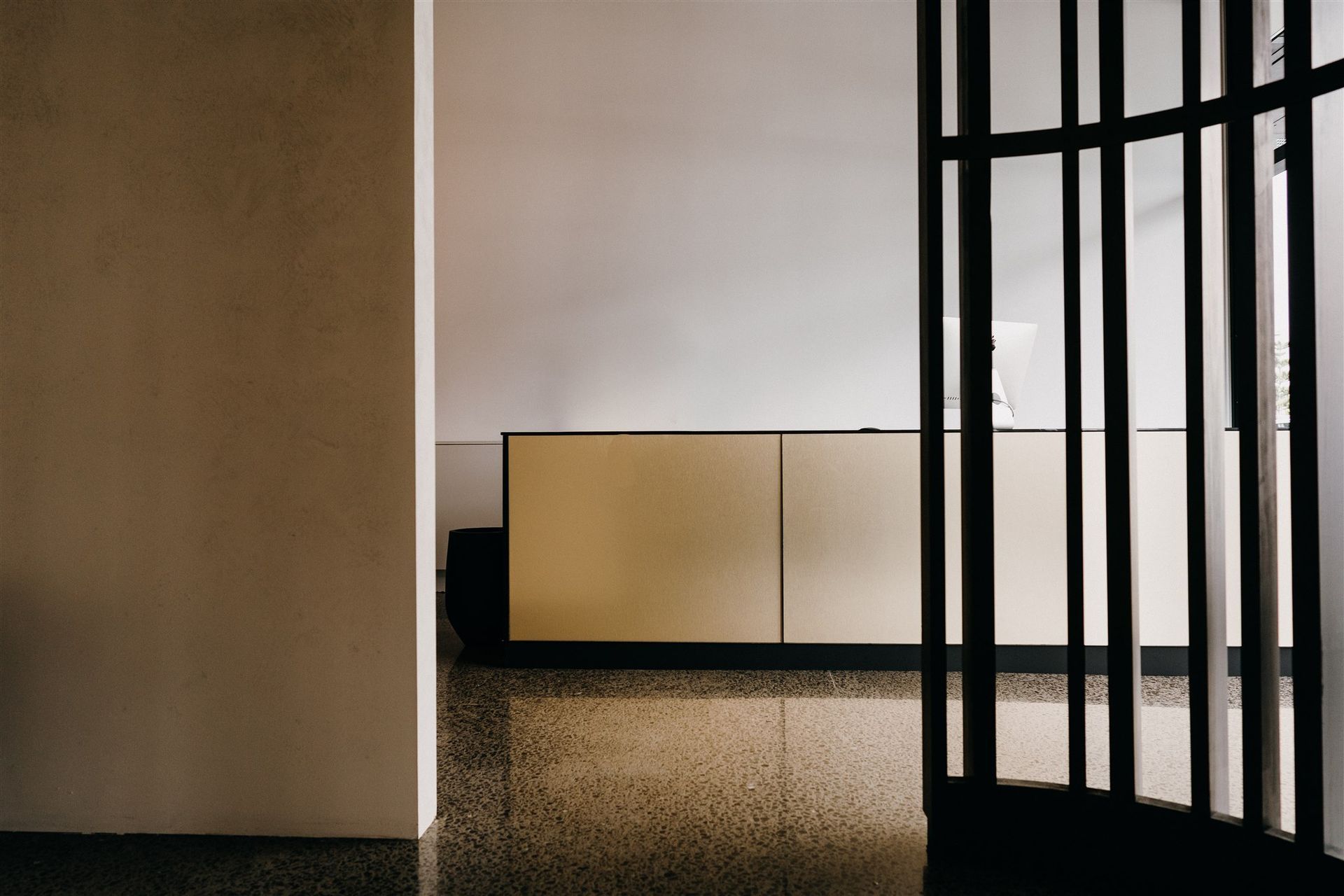 ArchiPro Project Summary - Contemporary fit-out of KCore Pilates studio in Auckland, featuring a high-end aesthetic with black, white, and brass elements, designed for functionality and connection to the exterior while ensuring privacy for an optimal workout experience.