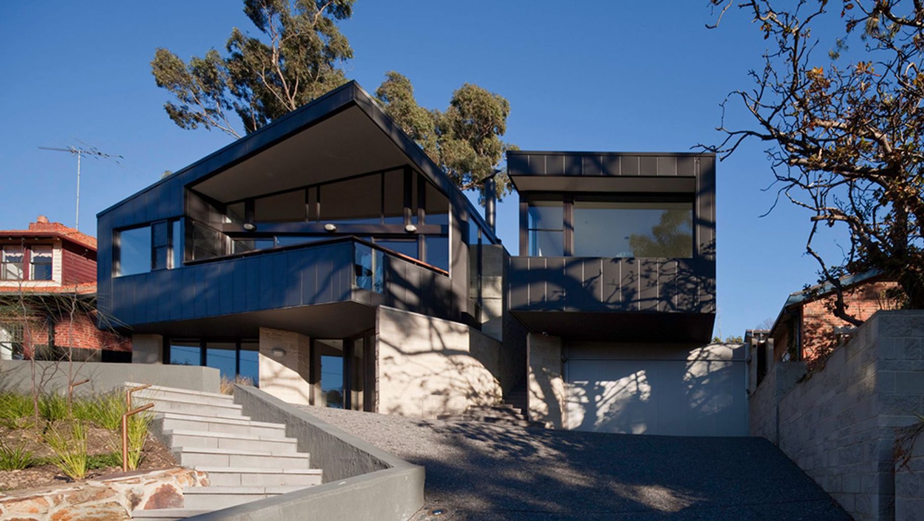 ArchiPro Project Summary - A contemporary family residence on a steep site, featuring elevated living spaces that embrace natural light and stunning treetop views, connected by a light-filled gallery and central courtyard.